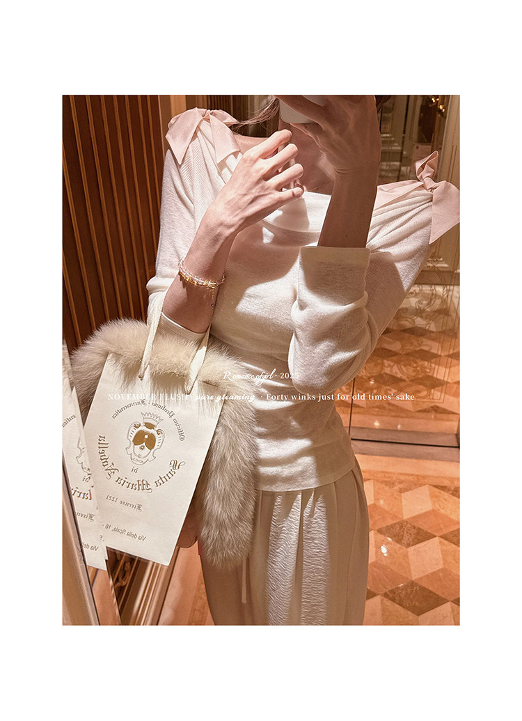 松紧处锁了一个小小的扣眼 真丝蝴蝶结丝带是可以拆卸 穿法很多way