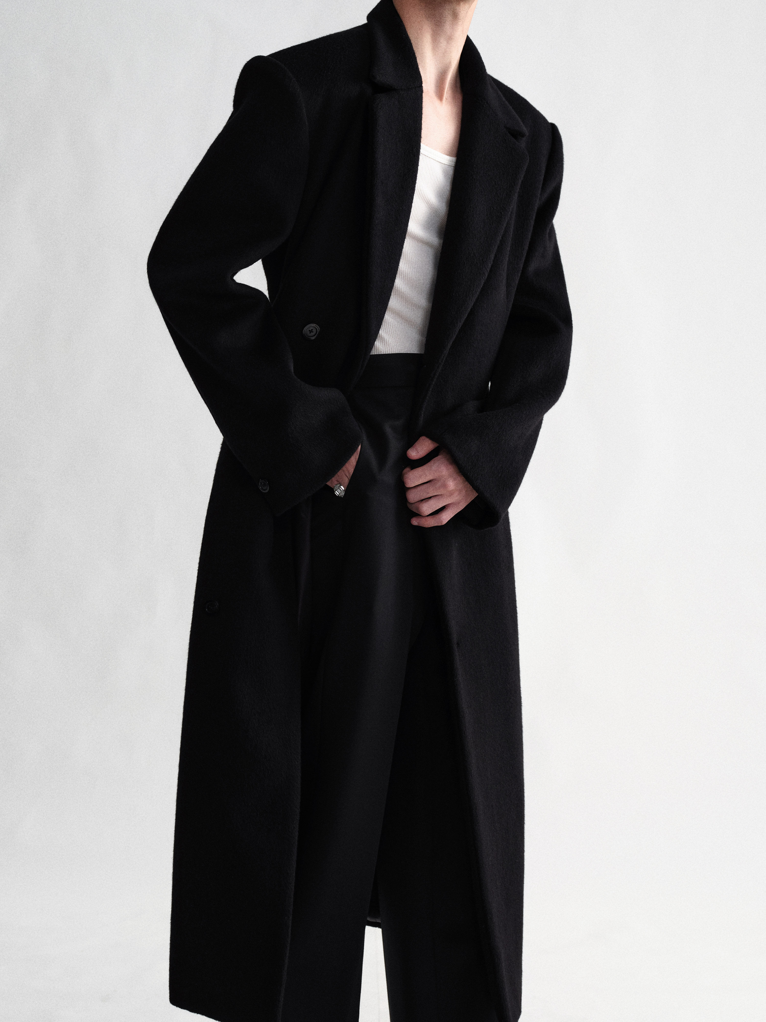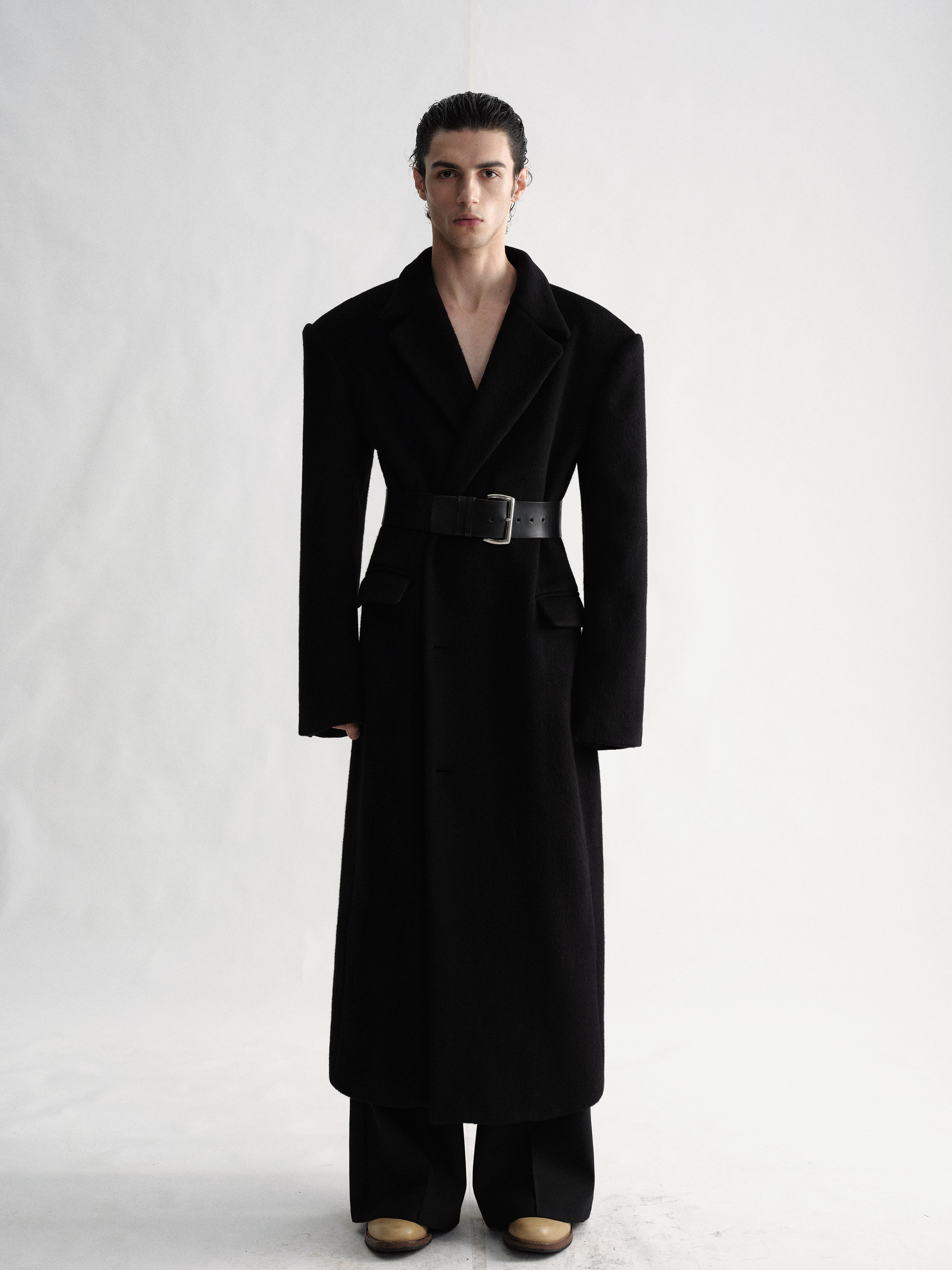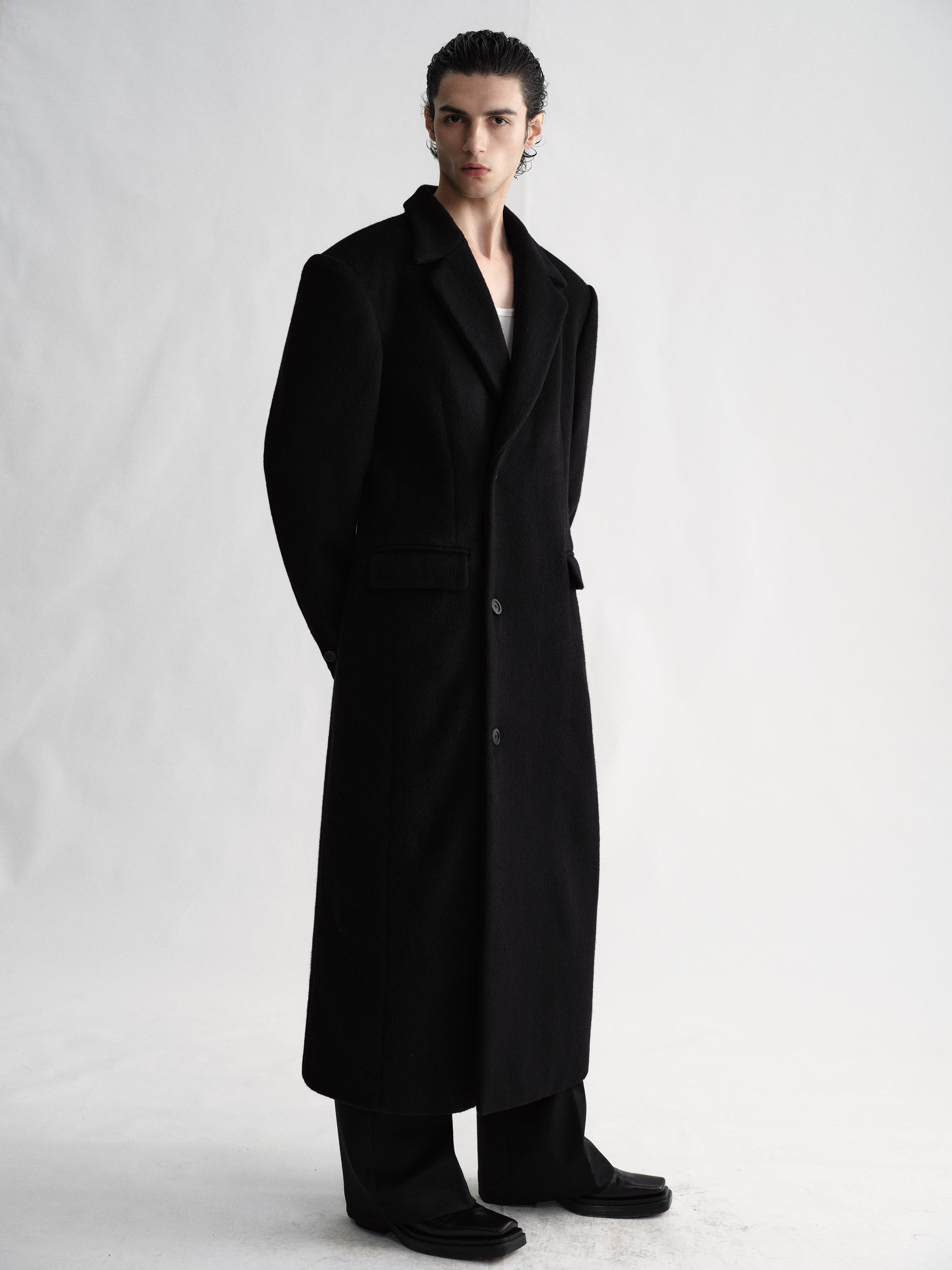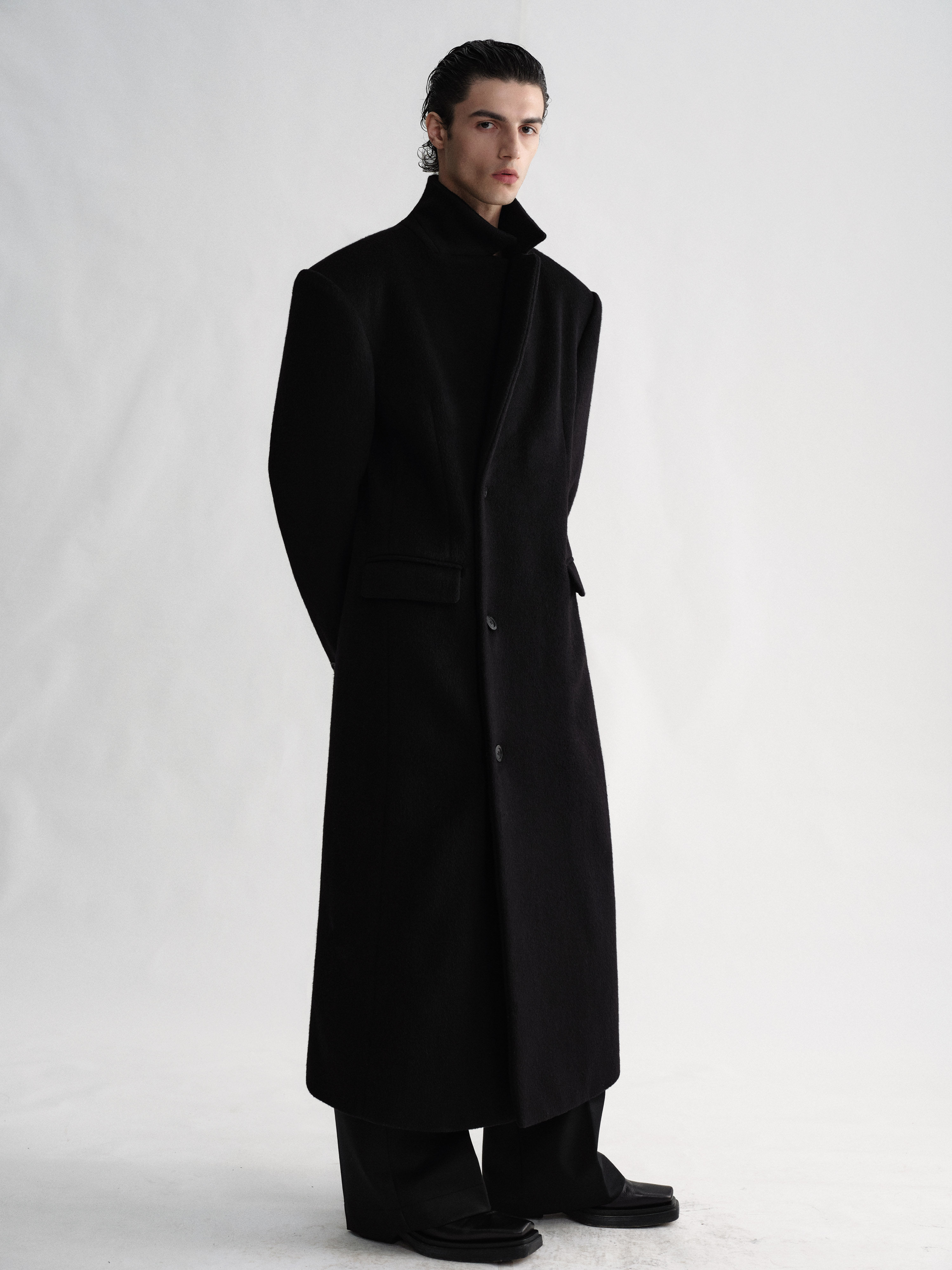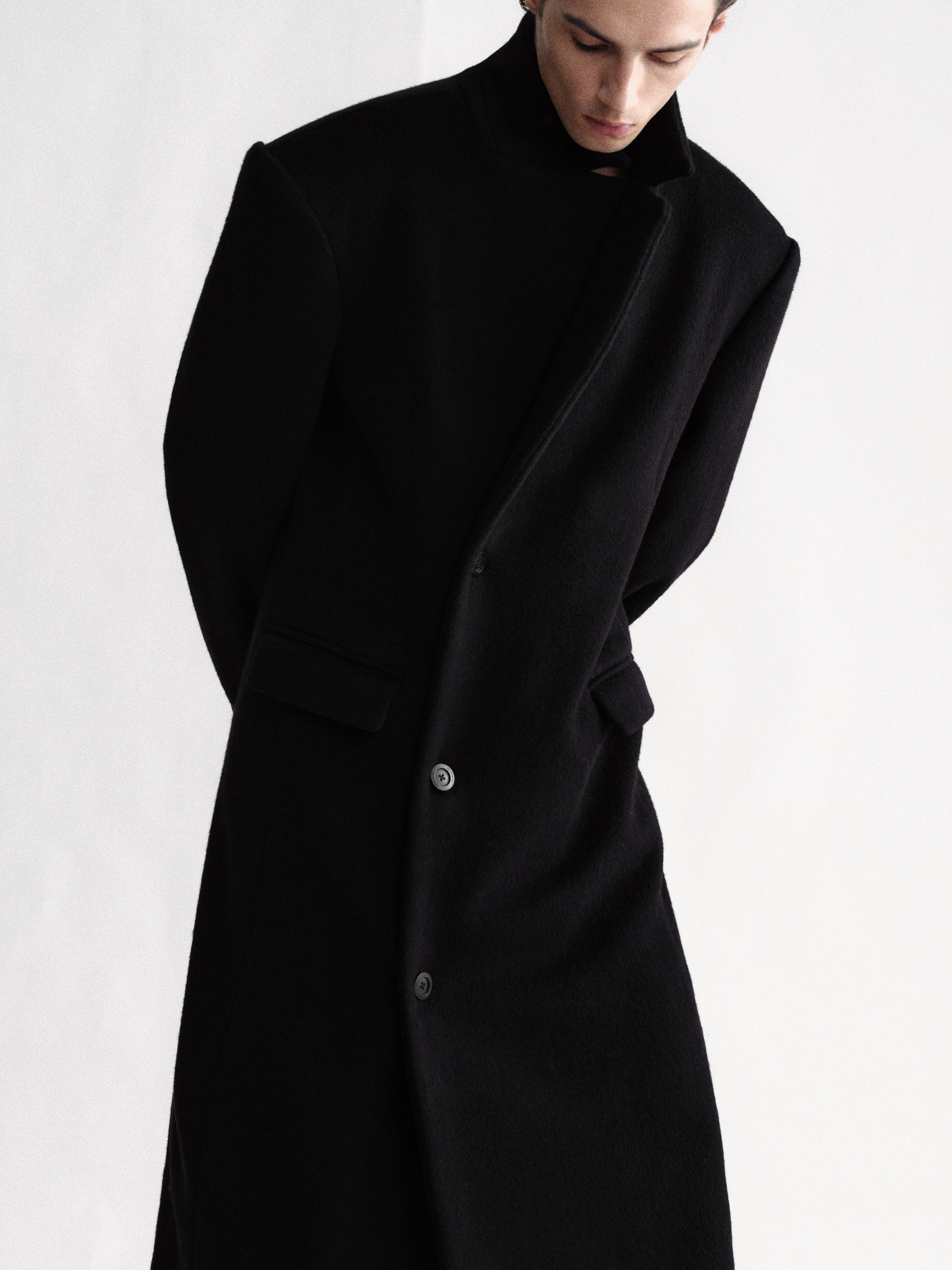 Sehenblau Designer Men's Clothing Minimalist Waist-Cinching Black Long Single-Breasted Wool Coat Woolen Jacket