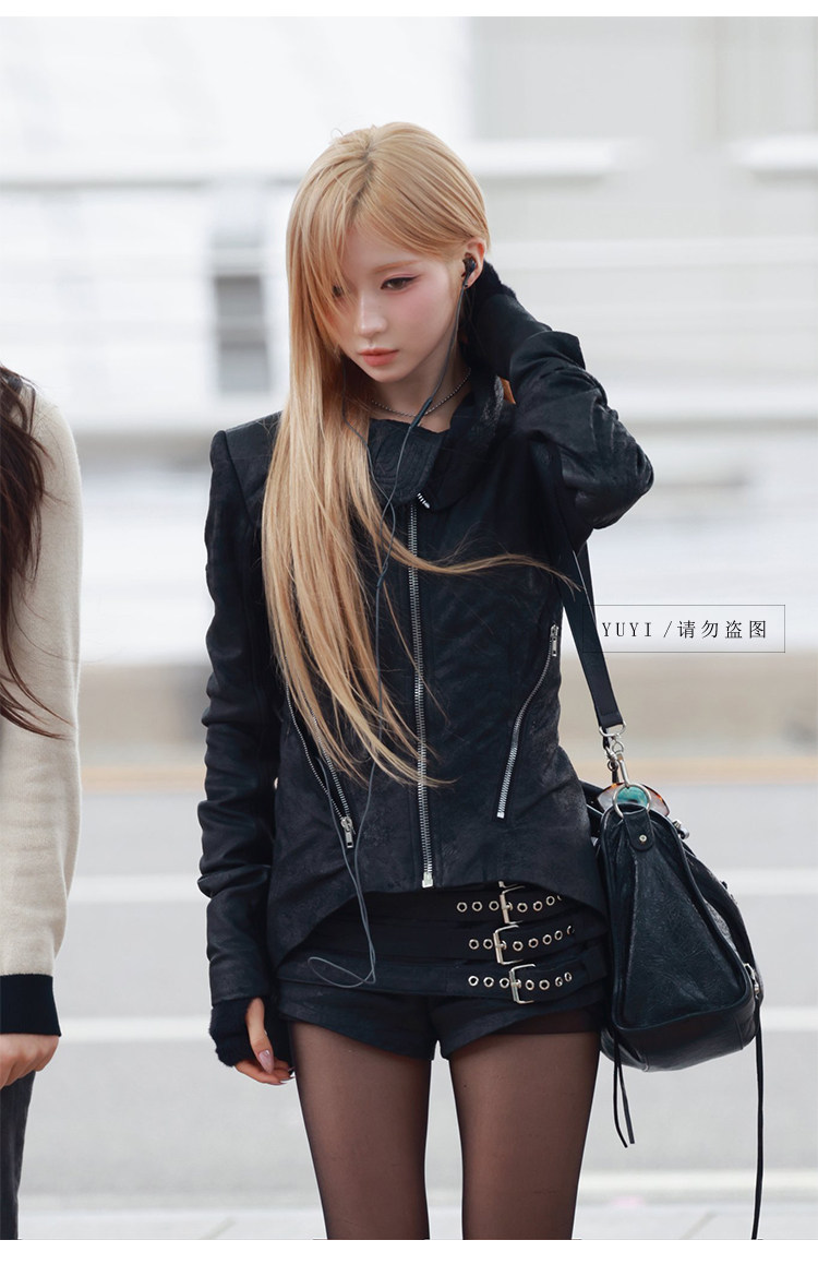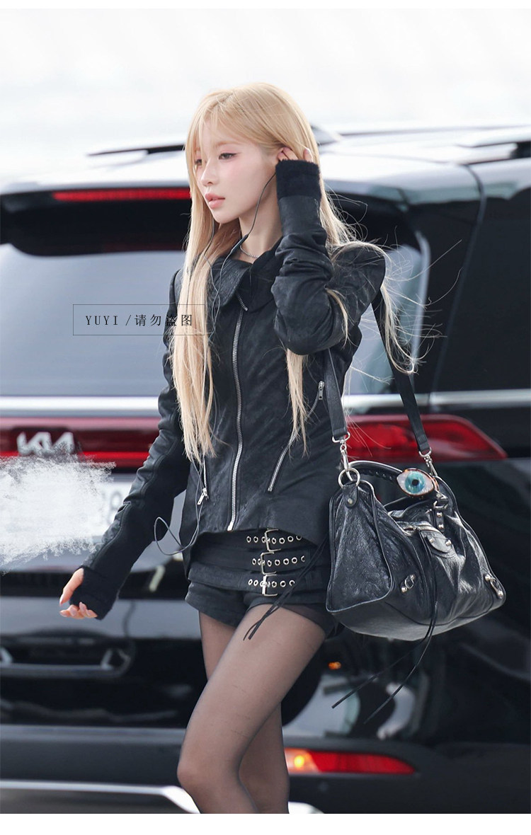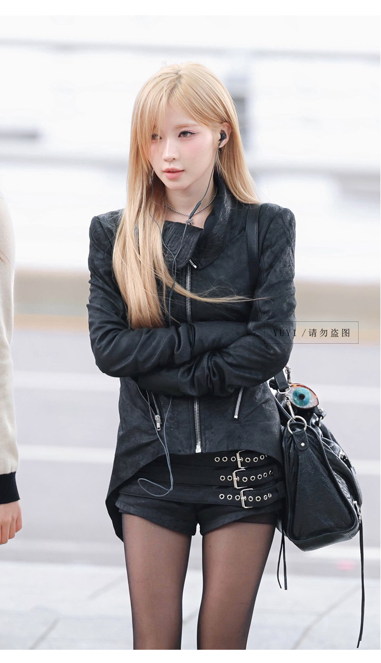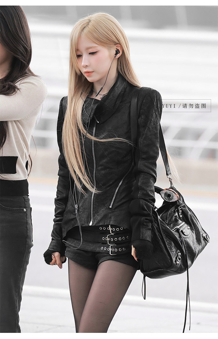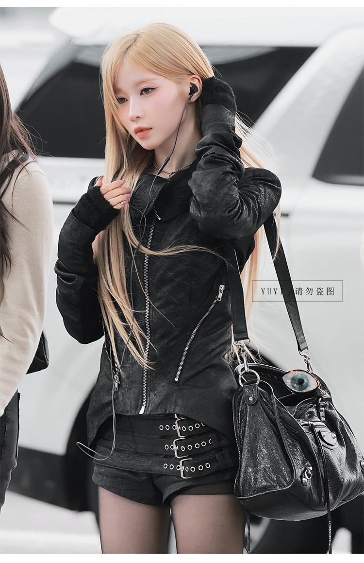 Asa Same Style Y2K Millennial Hot Girl Black Leather Jacket Waist-Cinching Slimming Short Coat High-Waisted Shorts Babymonster