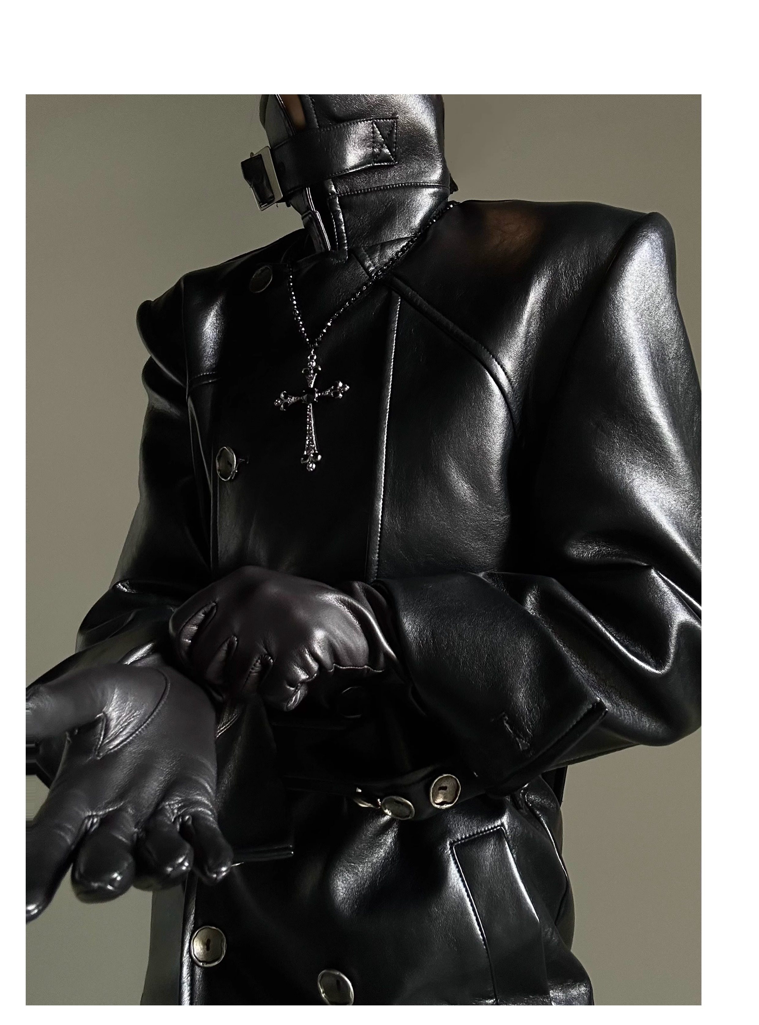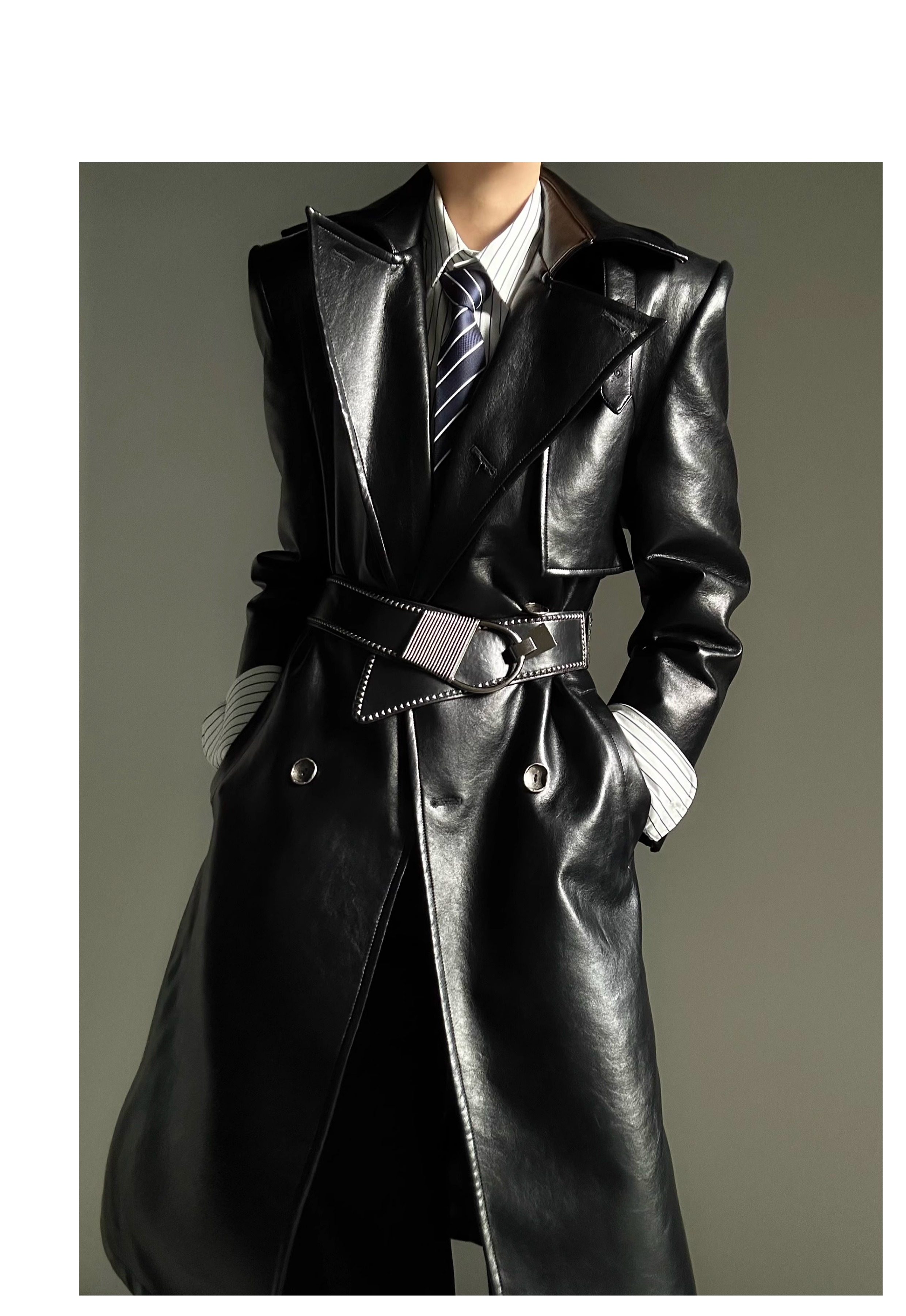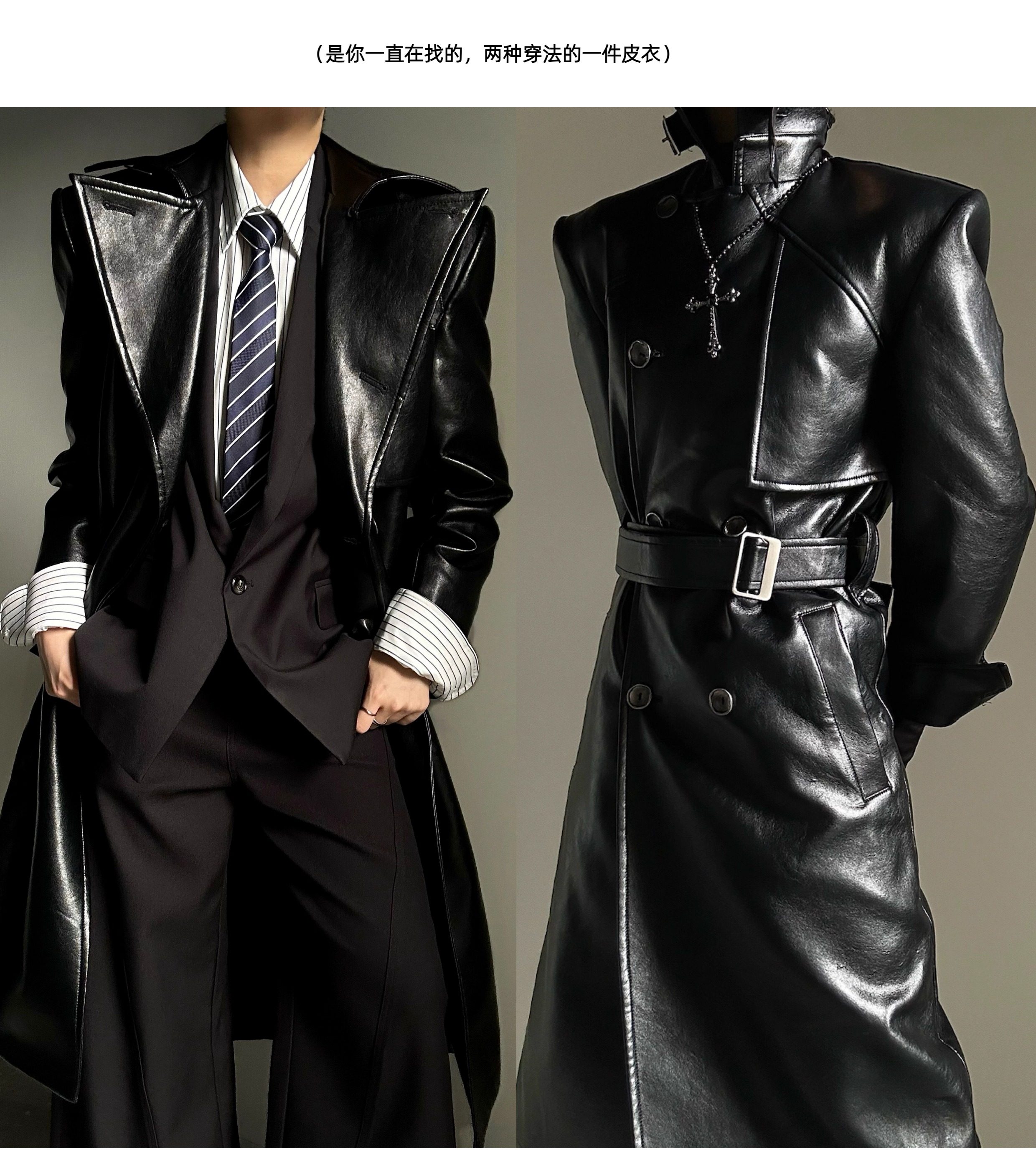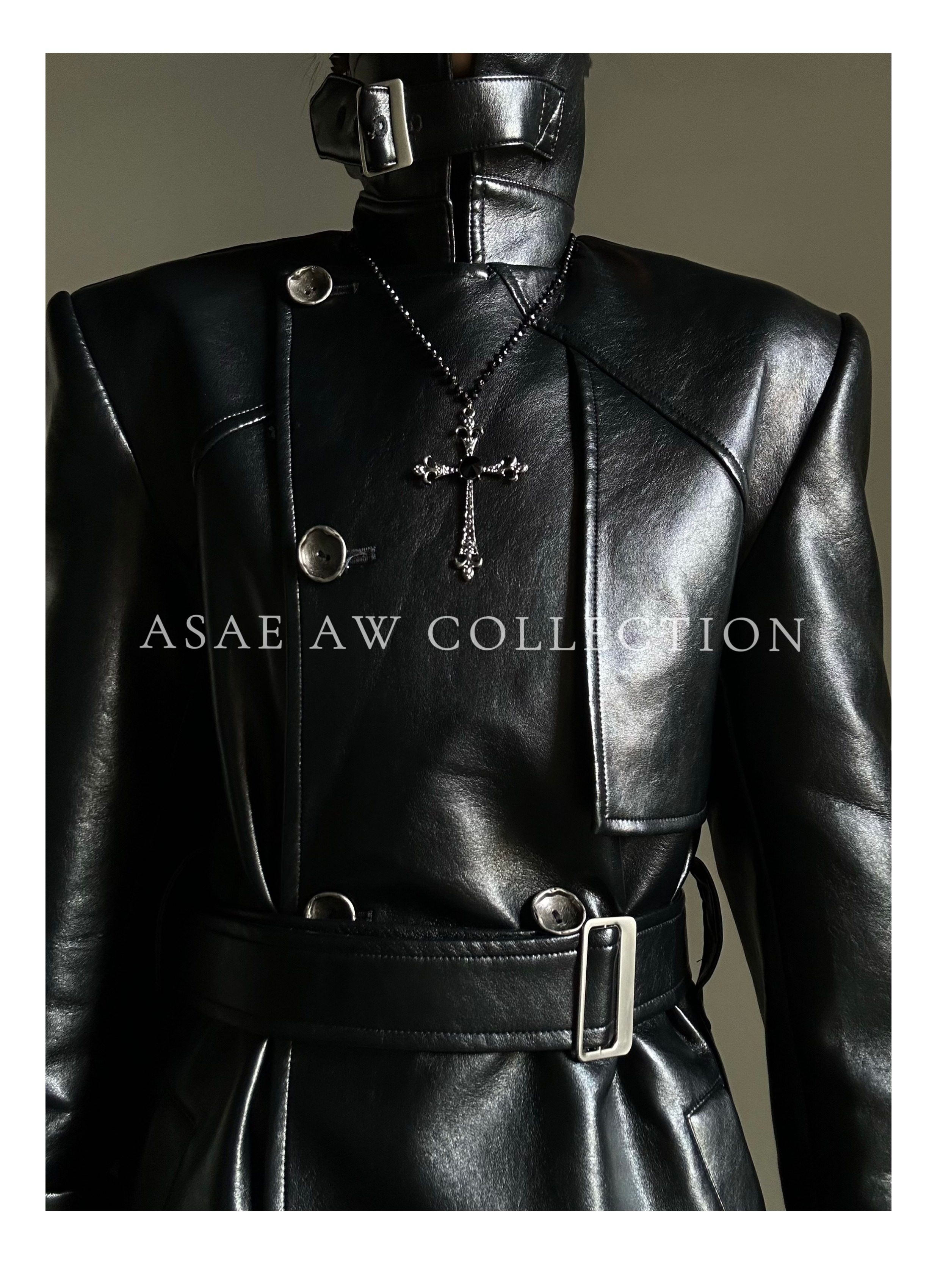 Asae Dark Style Leather Jacket, Mid-Length, Two Ways to Wear, Slimming, Waist-Cinching, Regular Shoulder Style, Silhouette Pu Coat Jacket