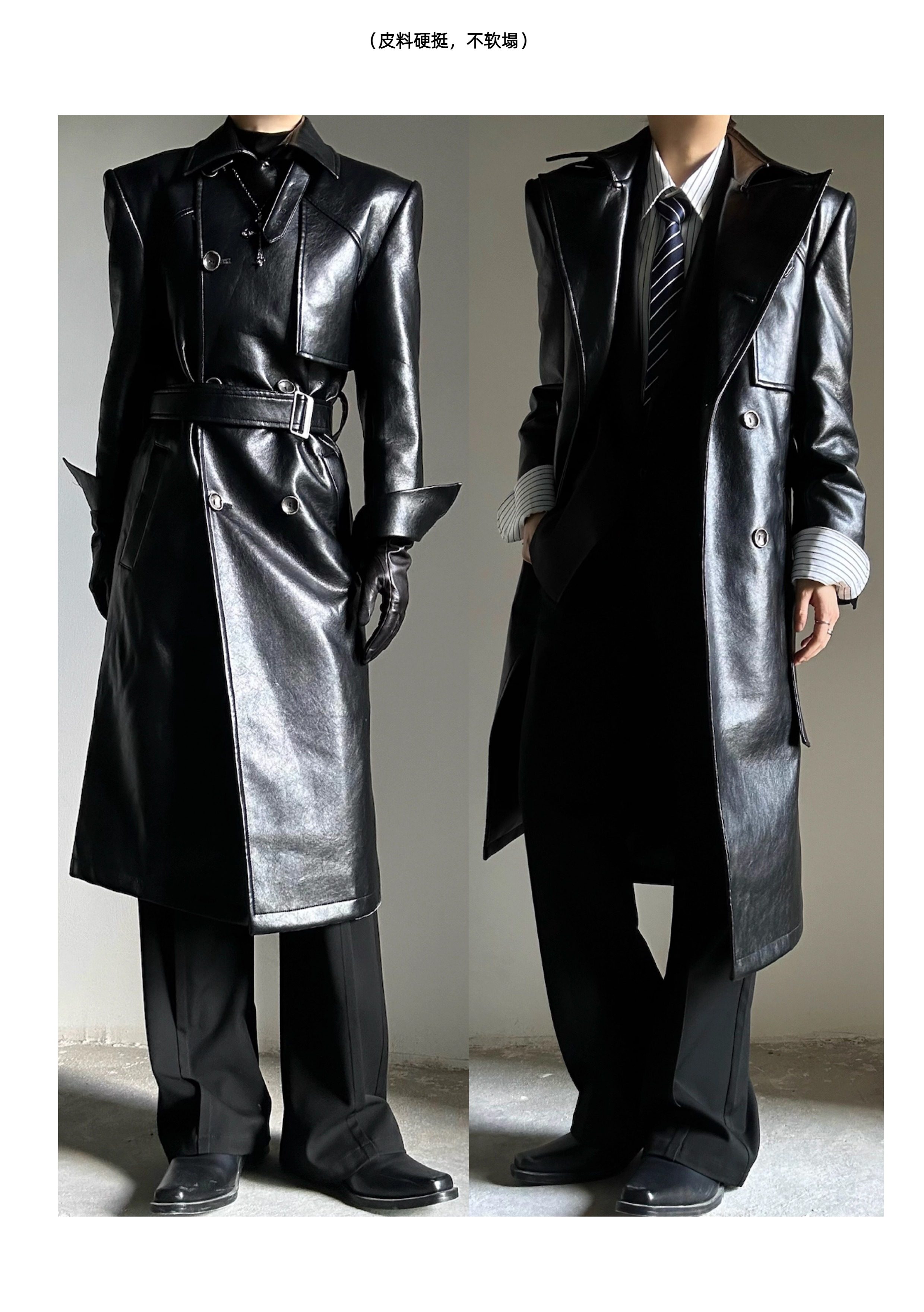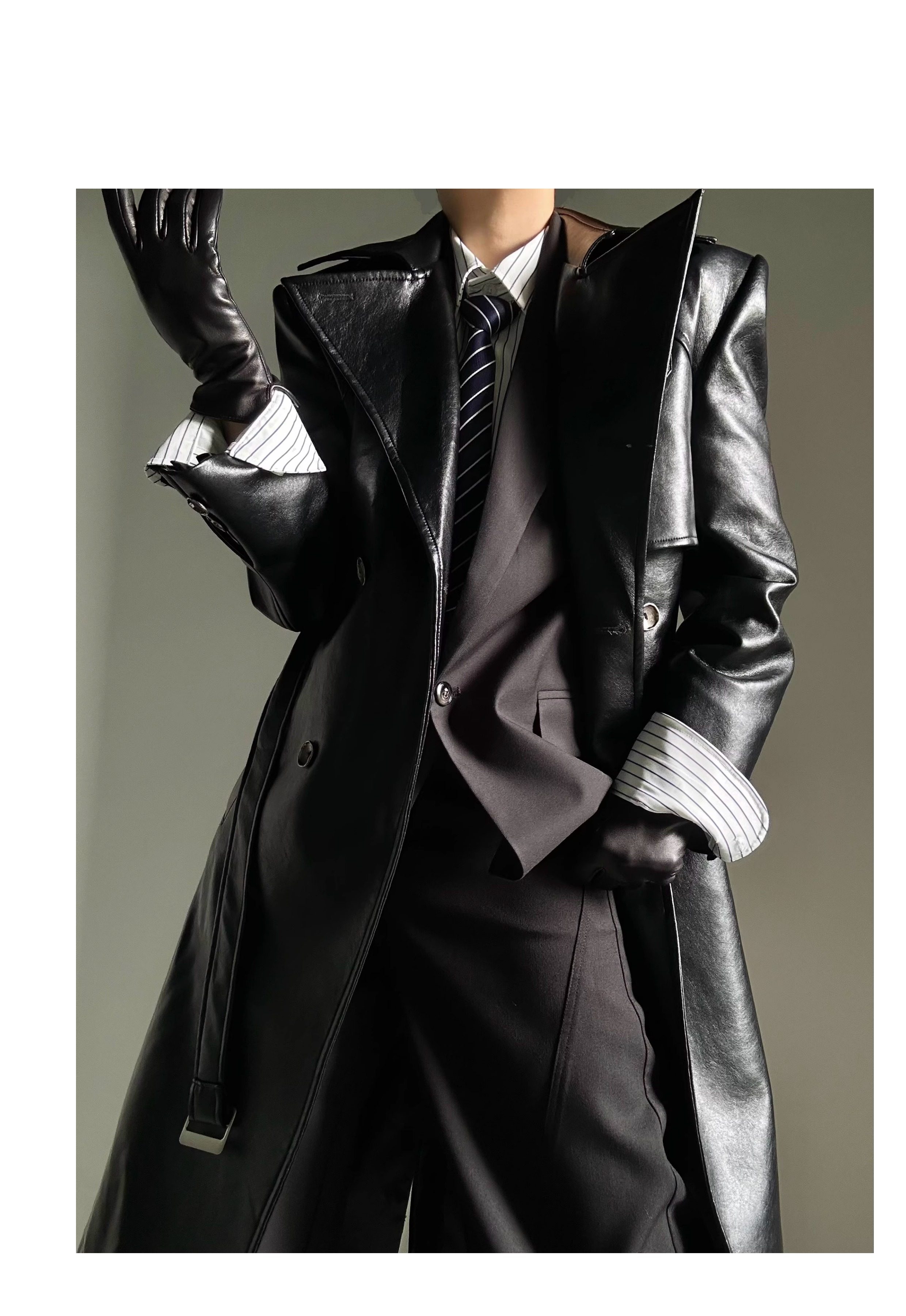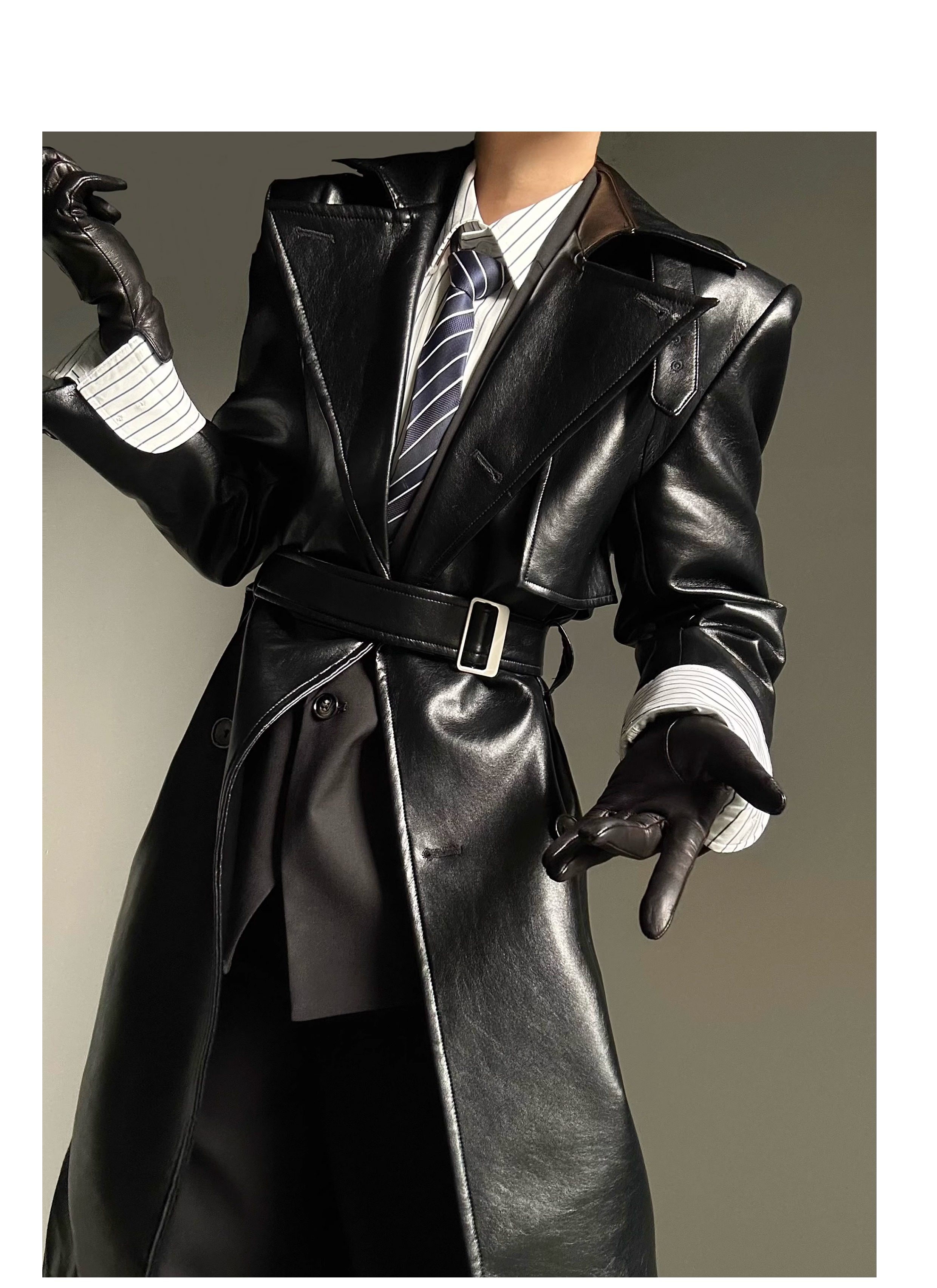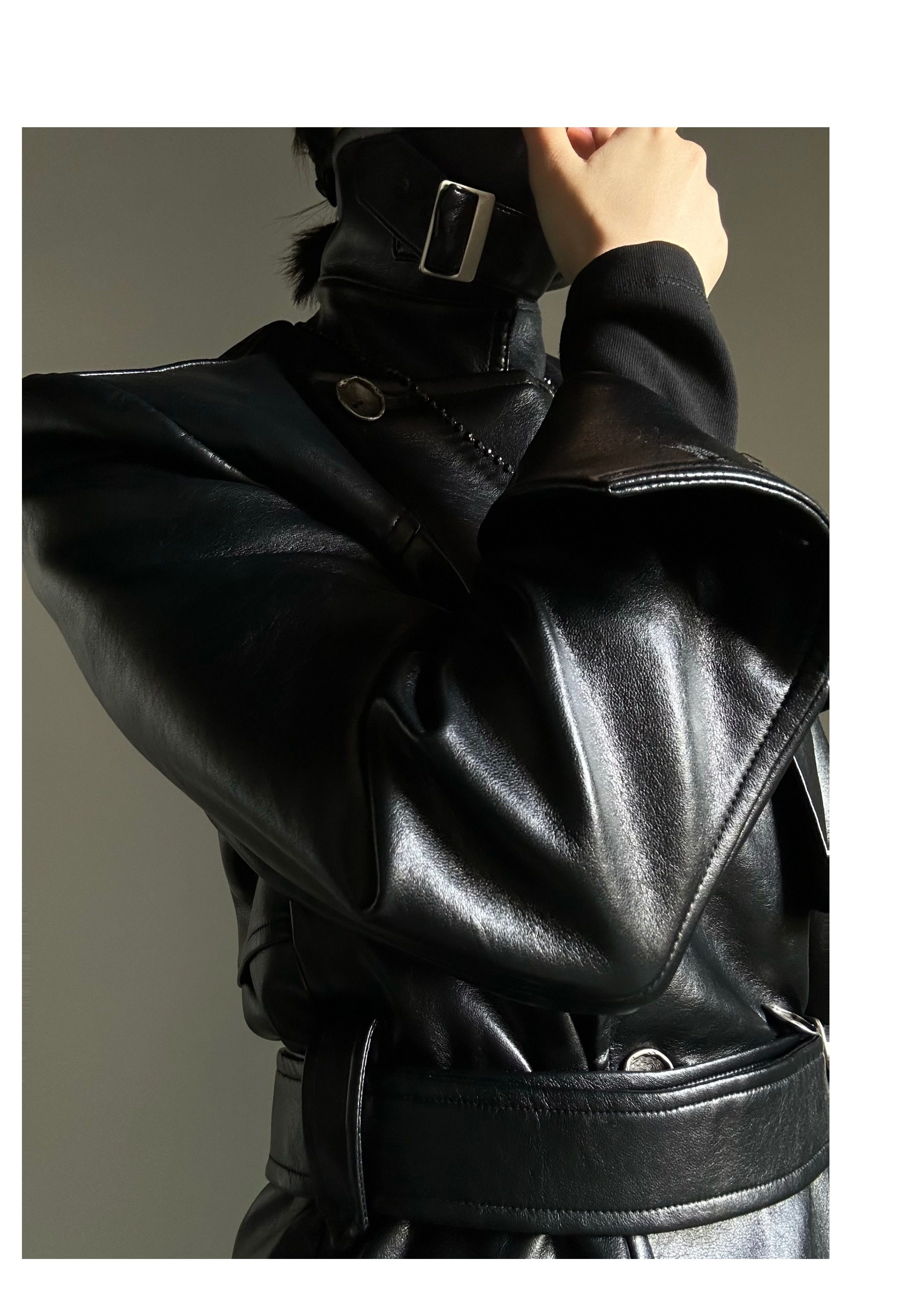 Asae Dark Style Leather Jacket, Mid-Length, Two Ways to Wear, Slimming, Waist-Cinching, Regular Shoulder Style, Silhouette Pu Coat Jacket