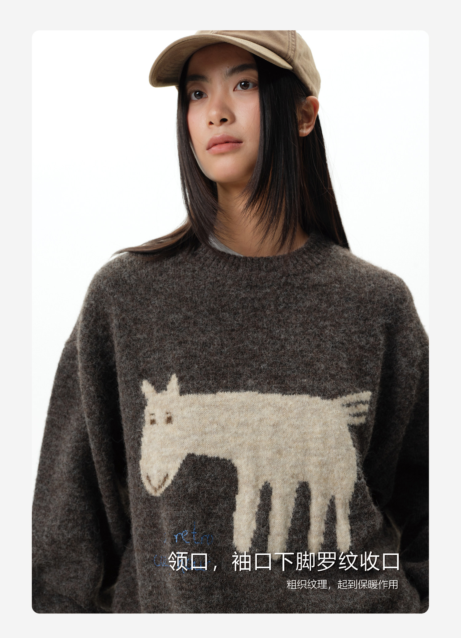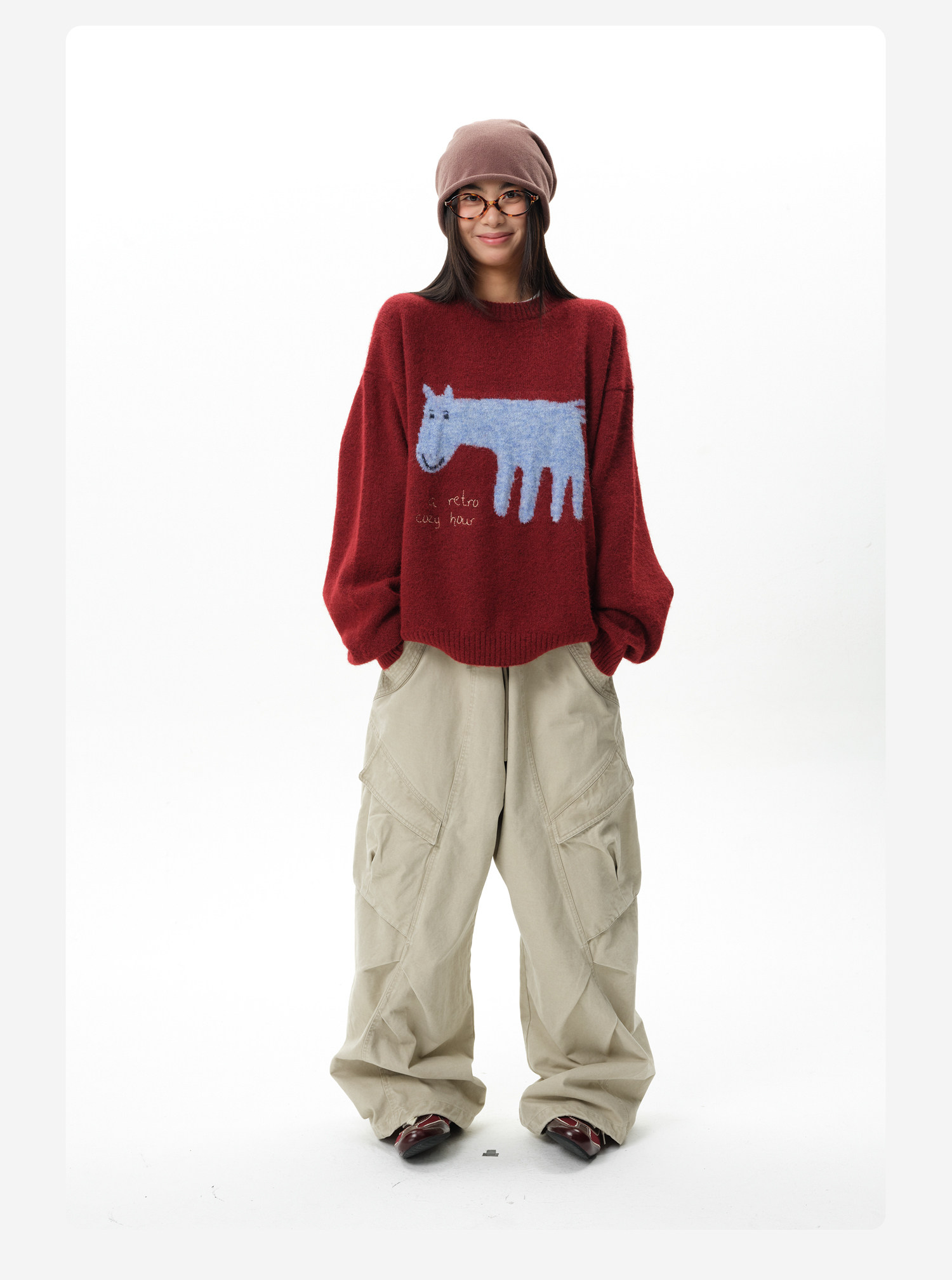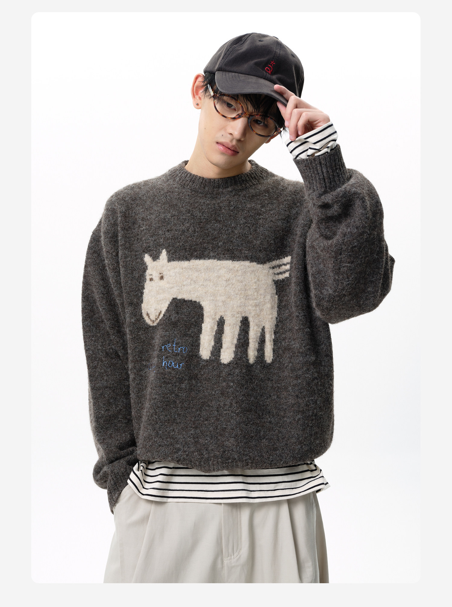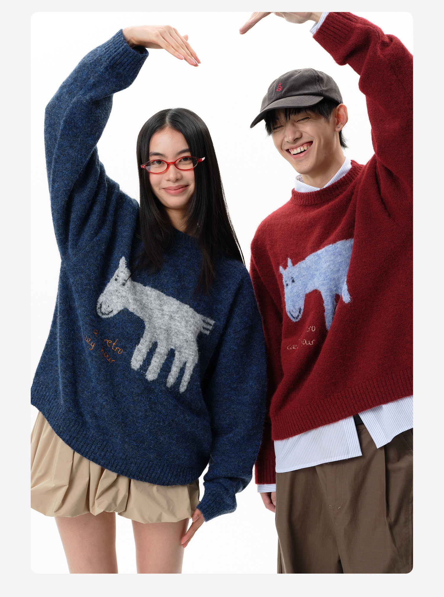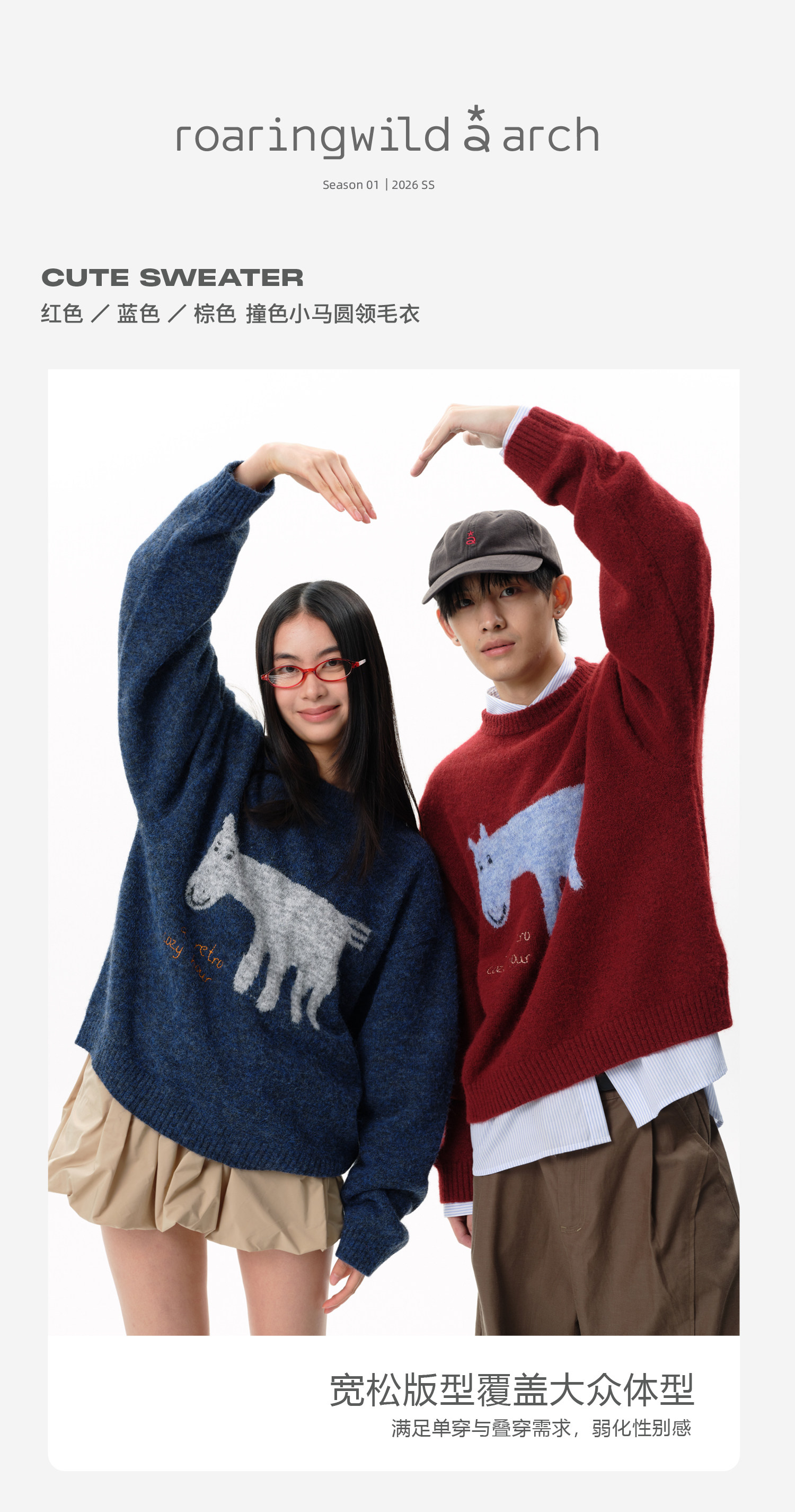 Roaringwild a Arch Roaring Beast Color-Blocked Pony Couple Style Loose Merino Wool Crew Neck Sweater for Men