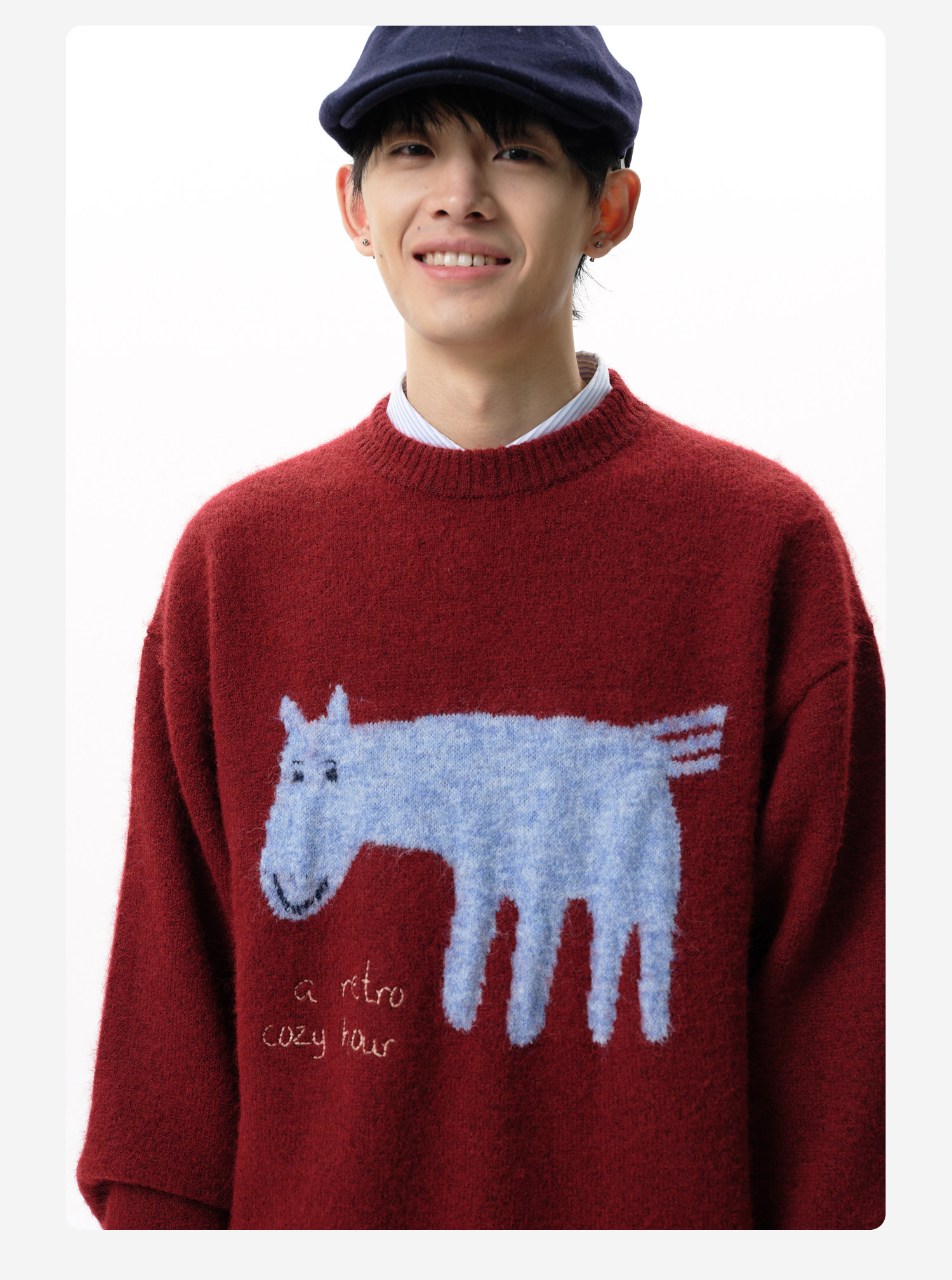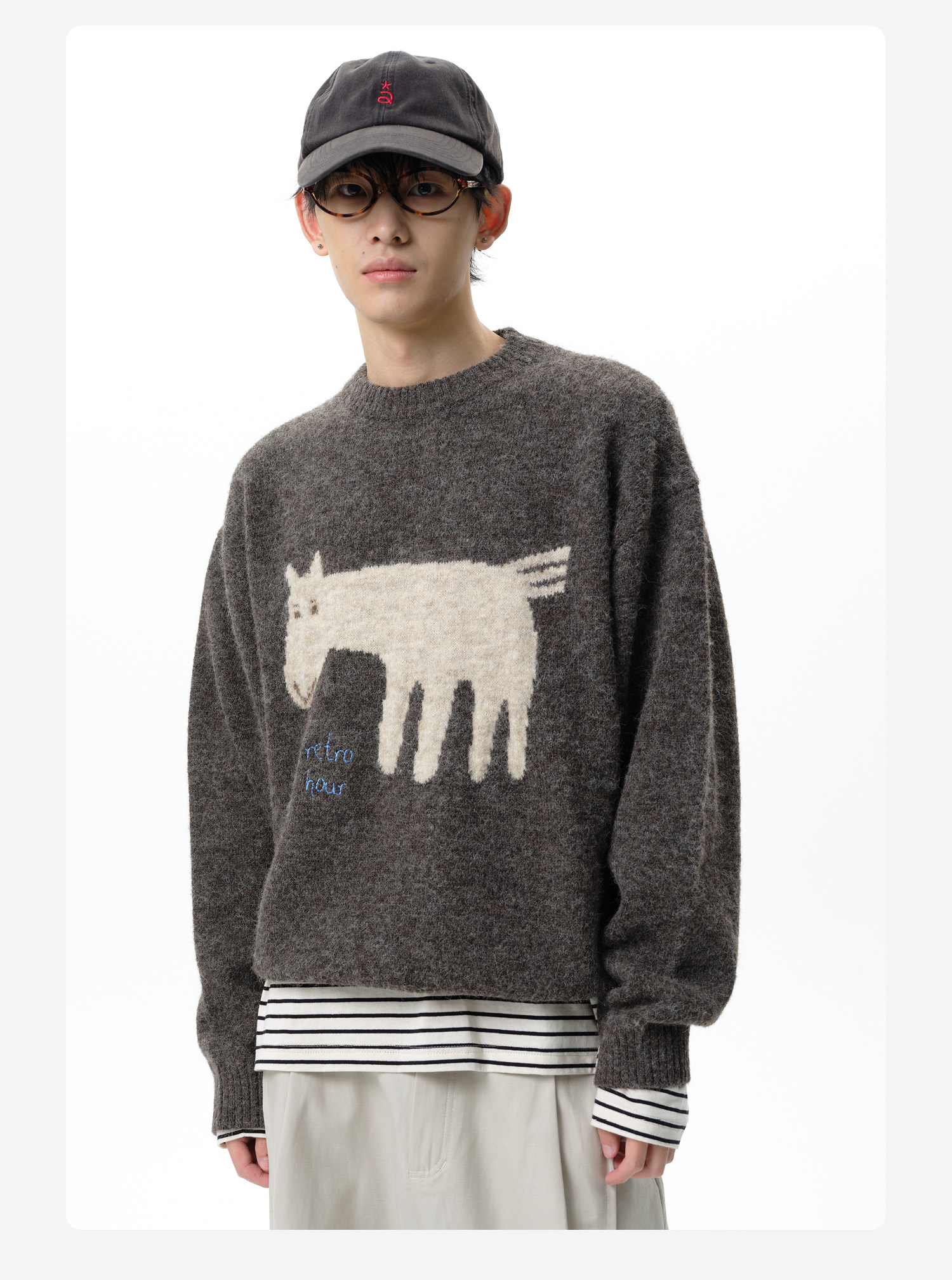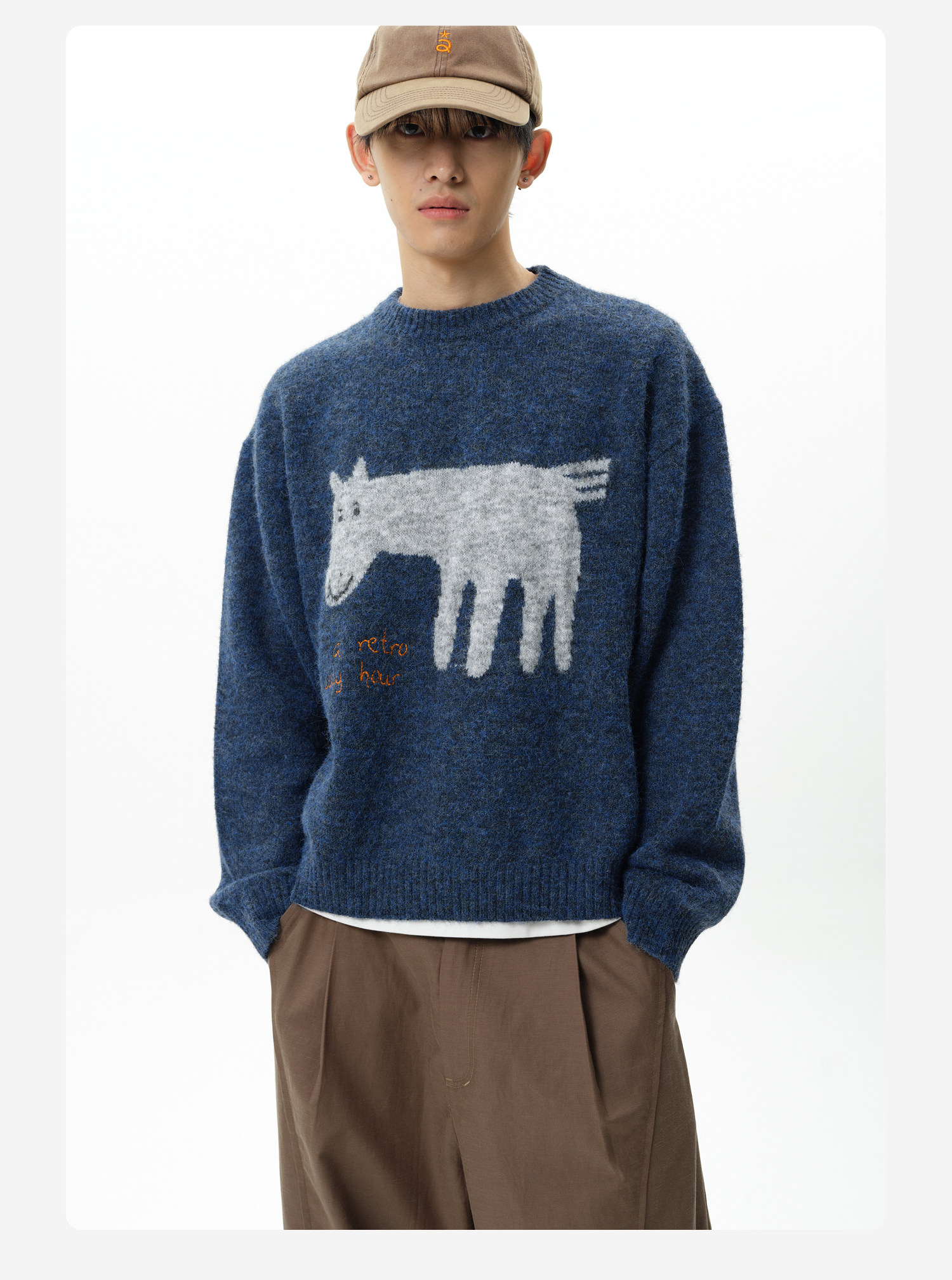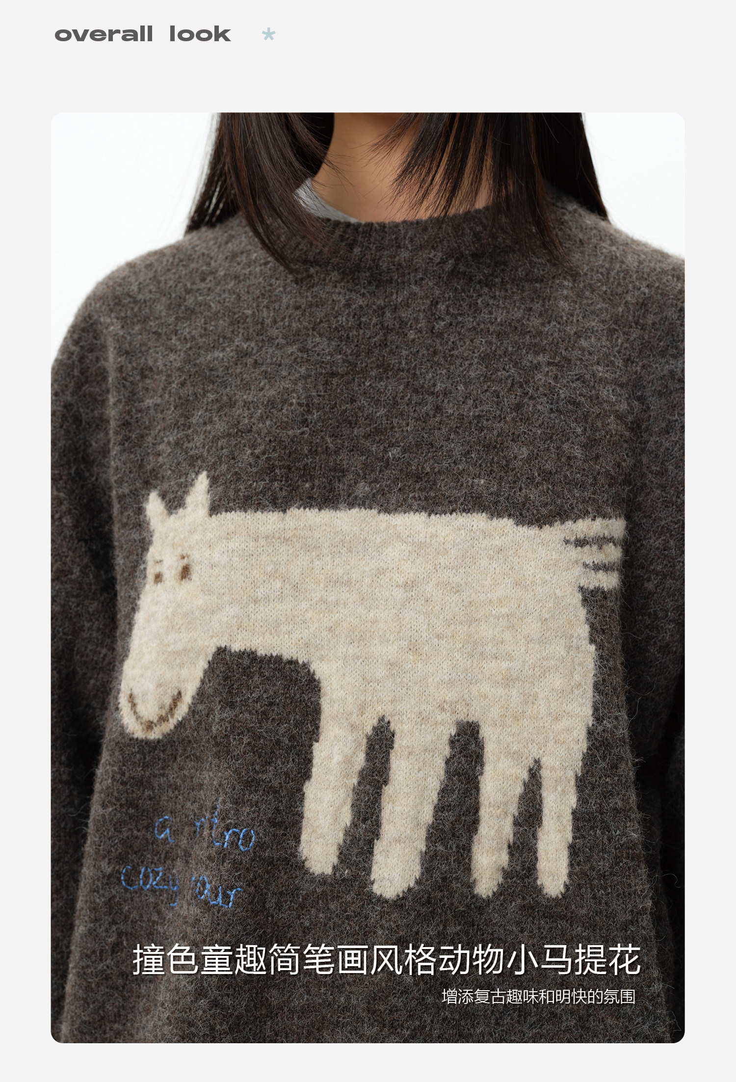 Roaringwild a Arch Roaring Beast Color-Blocked Pony Couple Style Loose Merino Wool Crew Neck Sweater for Men