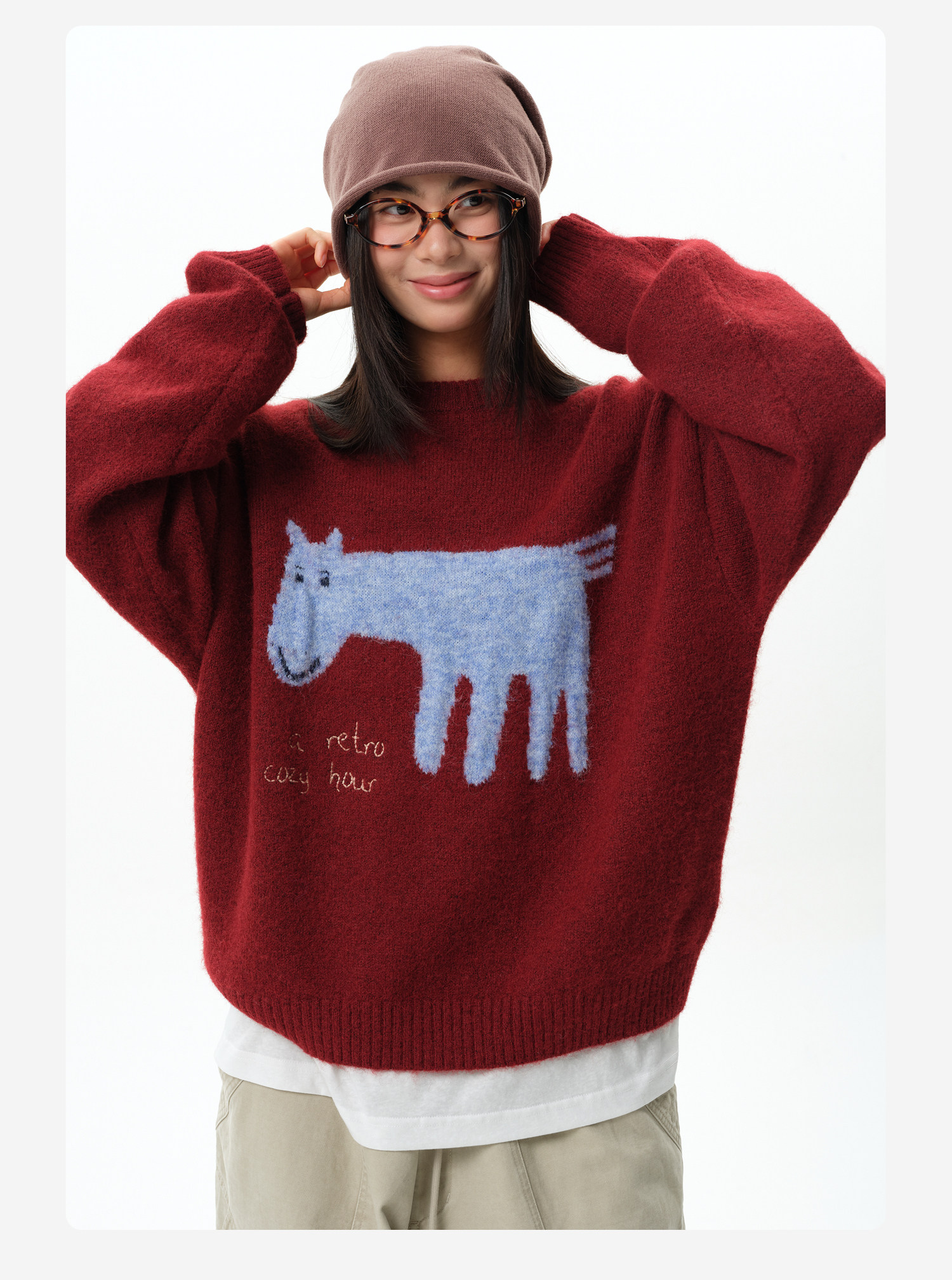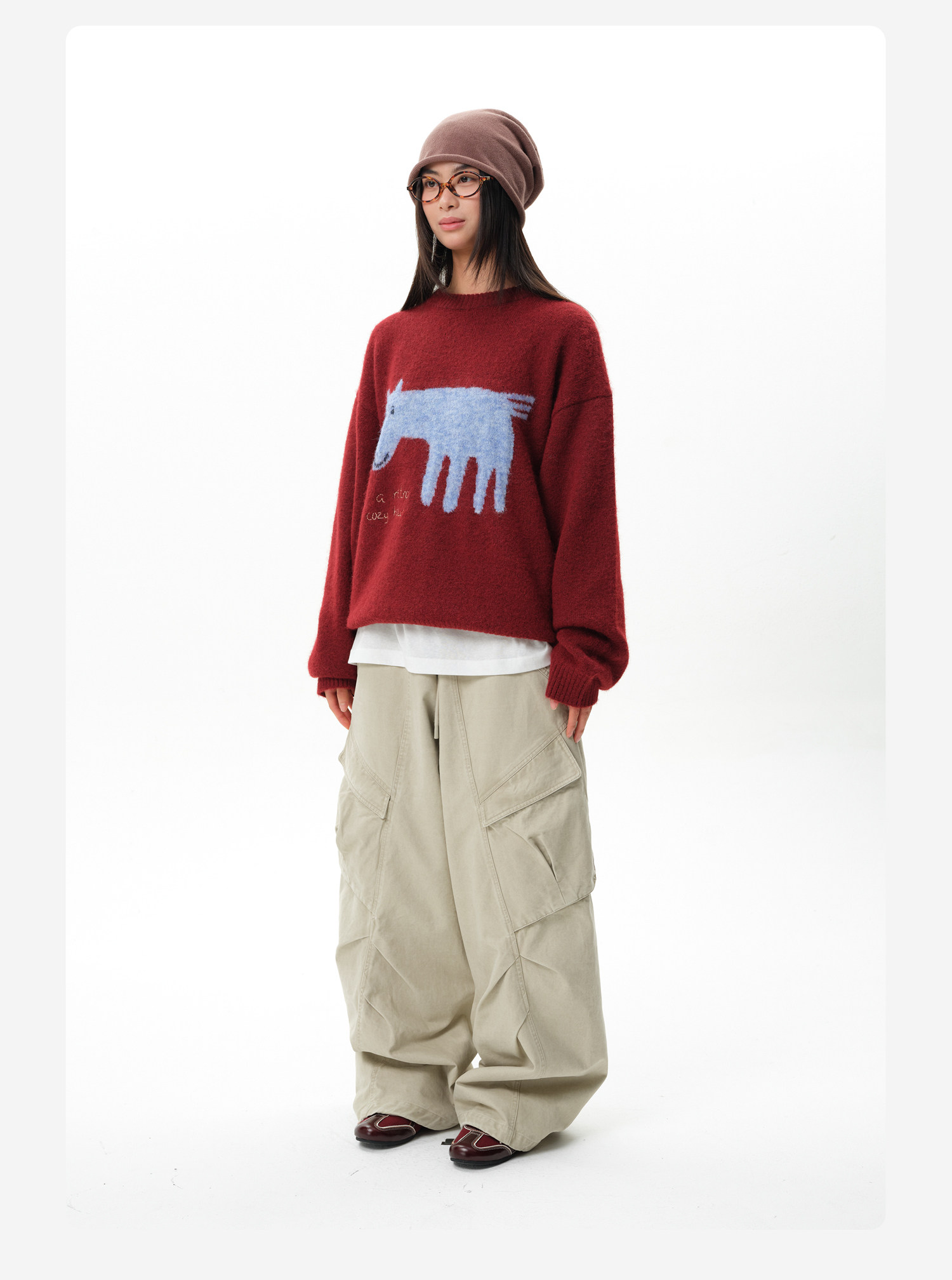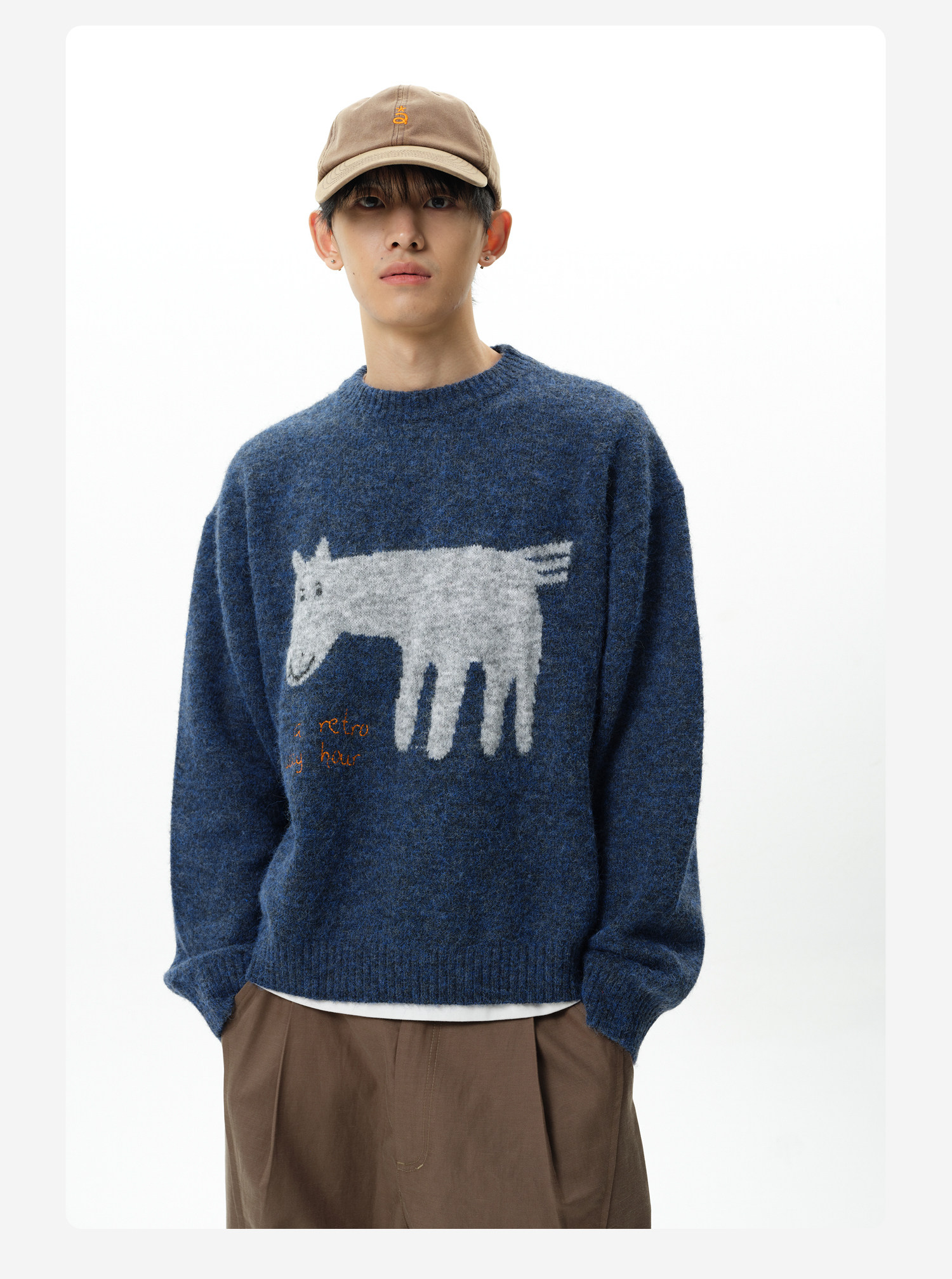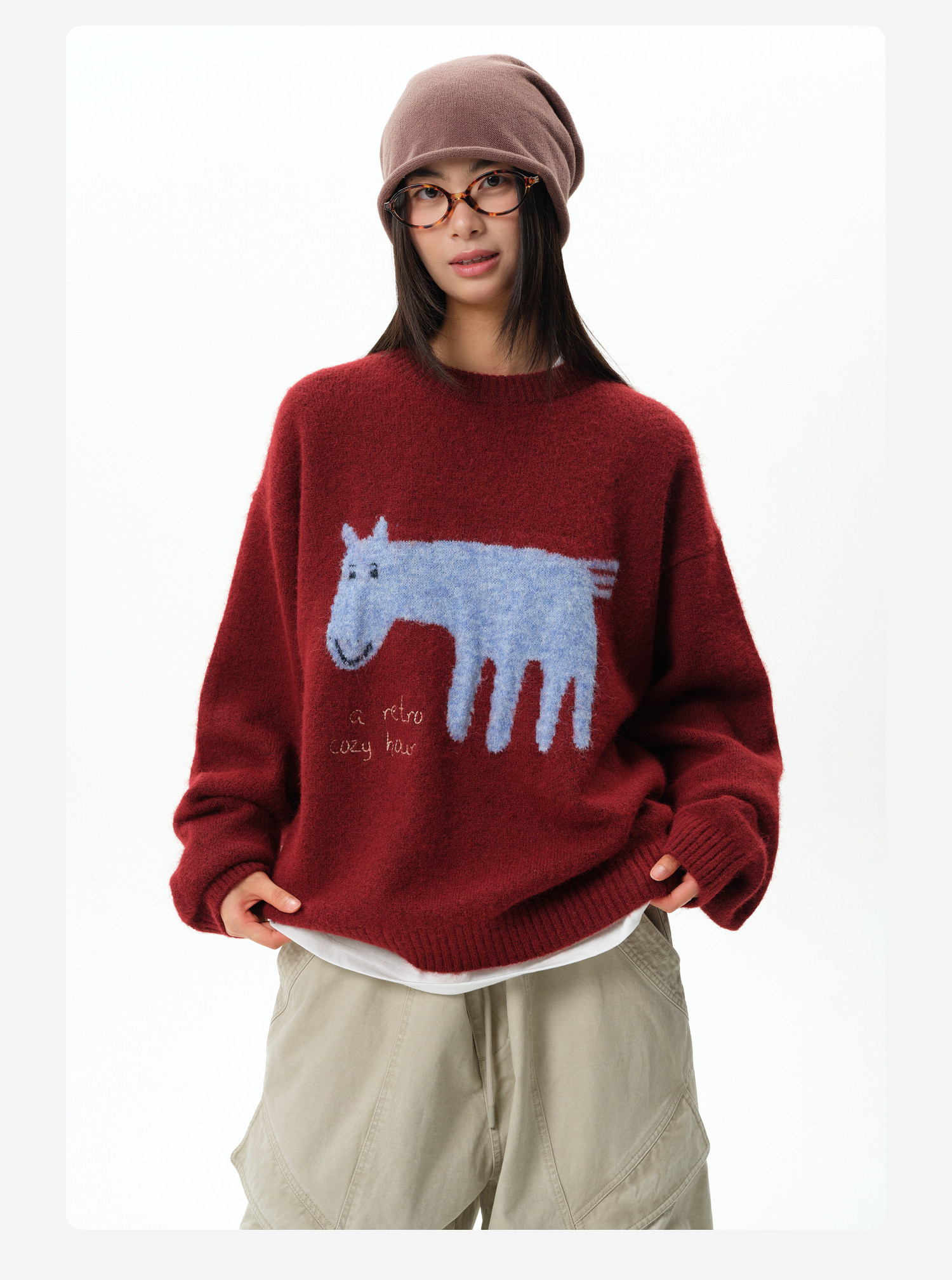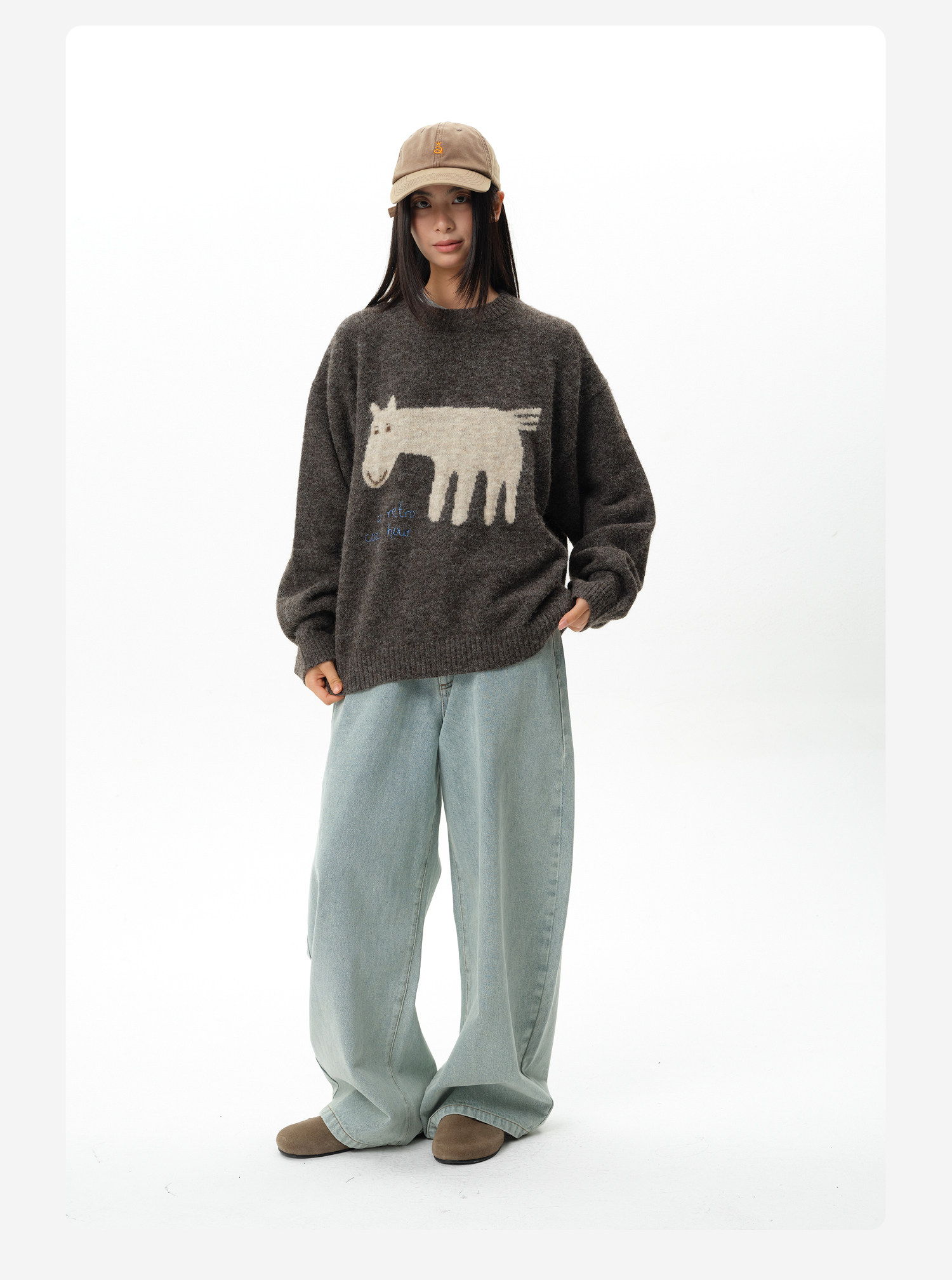 Roaringwild a Arch Roaring Beast Color-Blocked Pony Couple Style Loose Merino Wool Crew Neck Sweater for Men