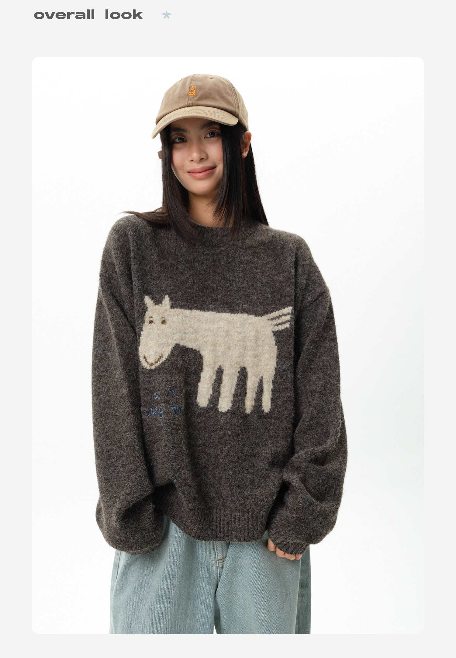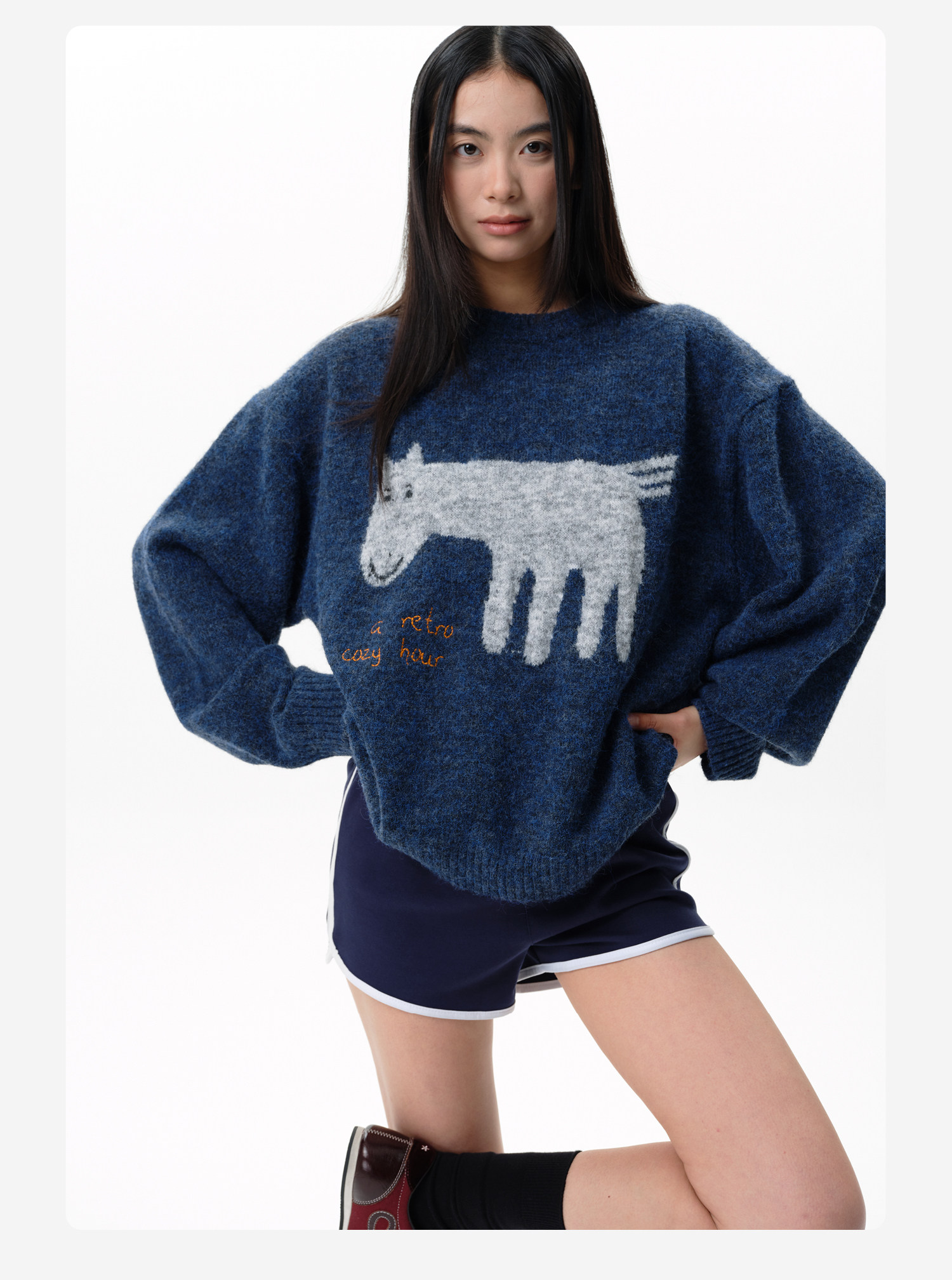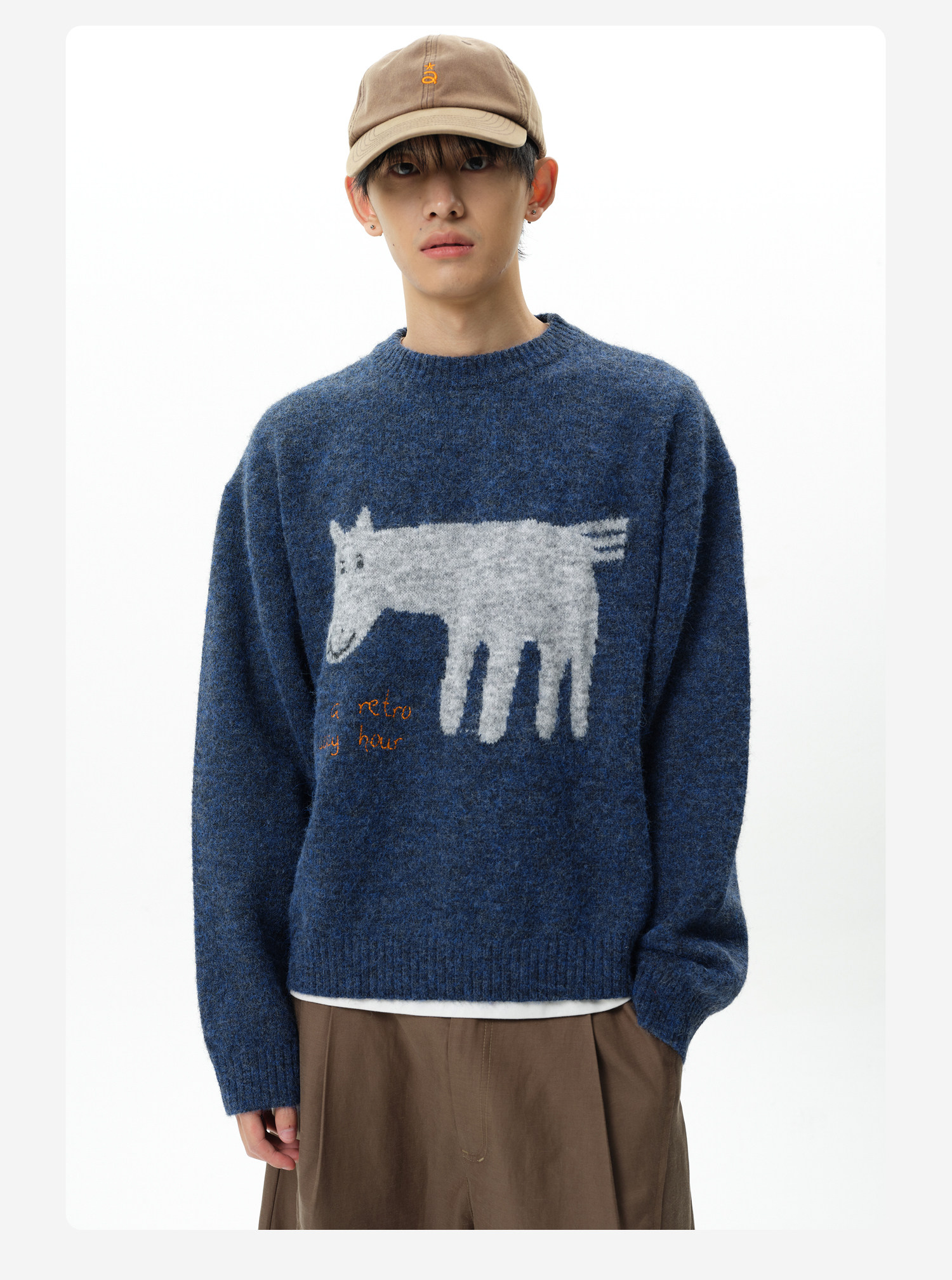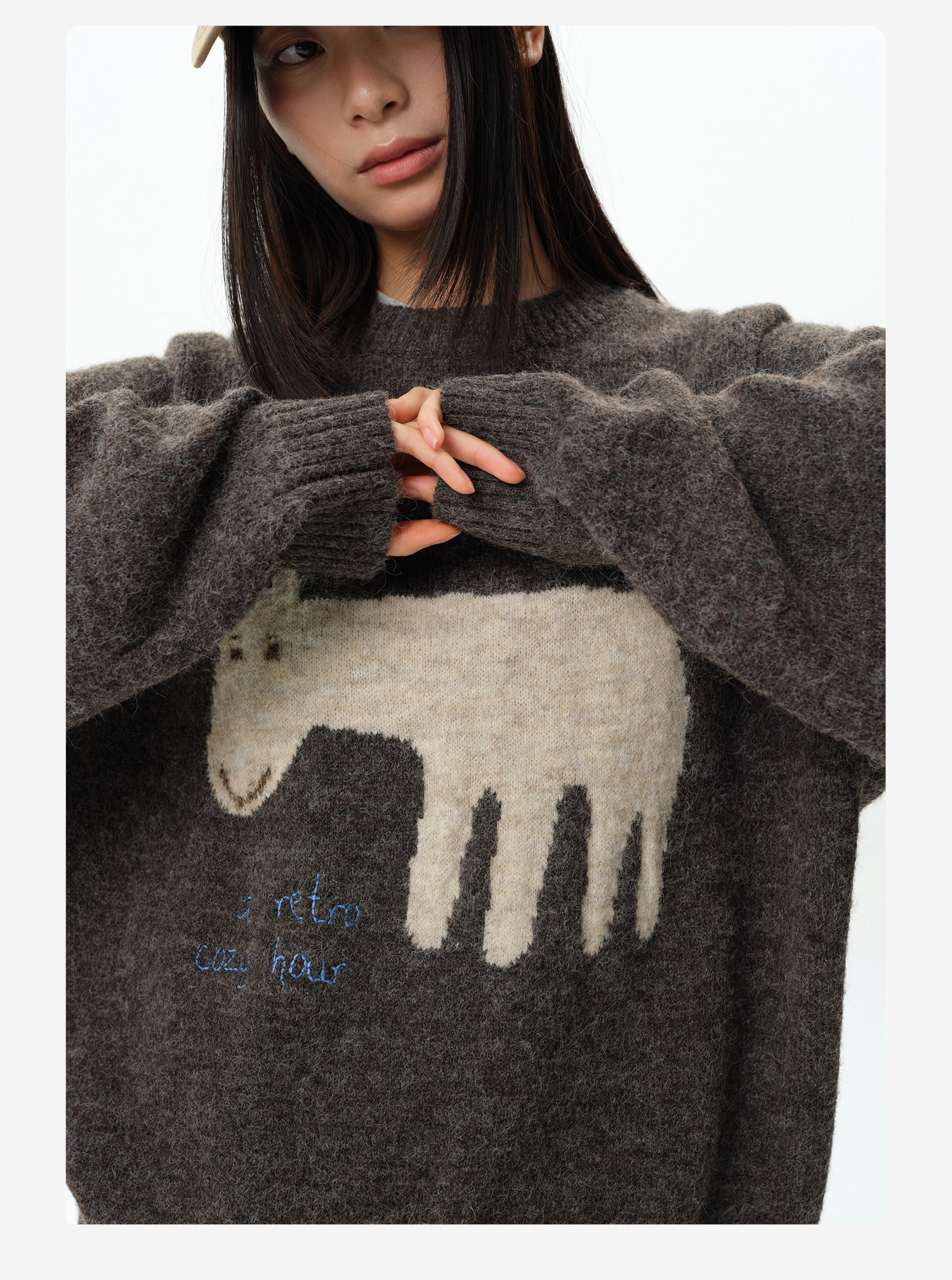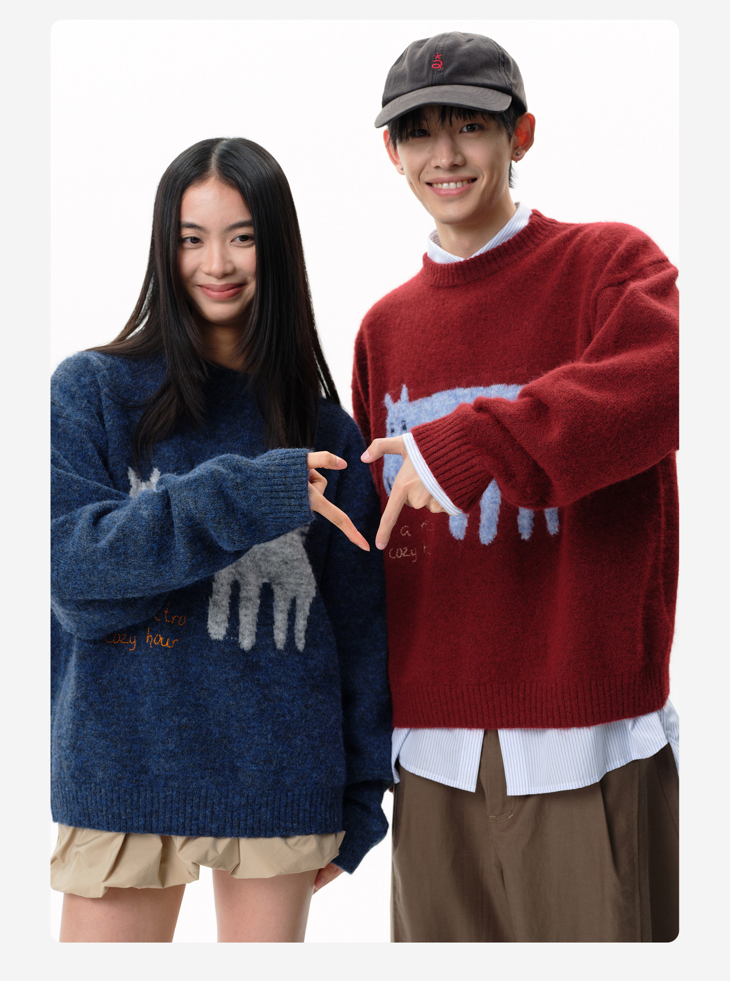 Roaringwild a Arch Roaring Beast Color-Blocked Pony Couple Style Loose Merino Wool Crew Neck Sweater for Men