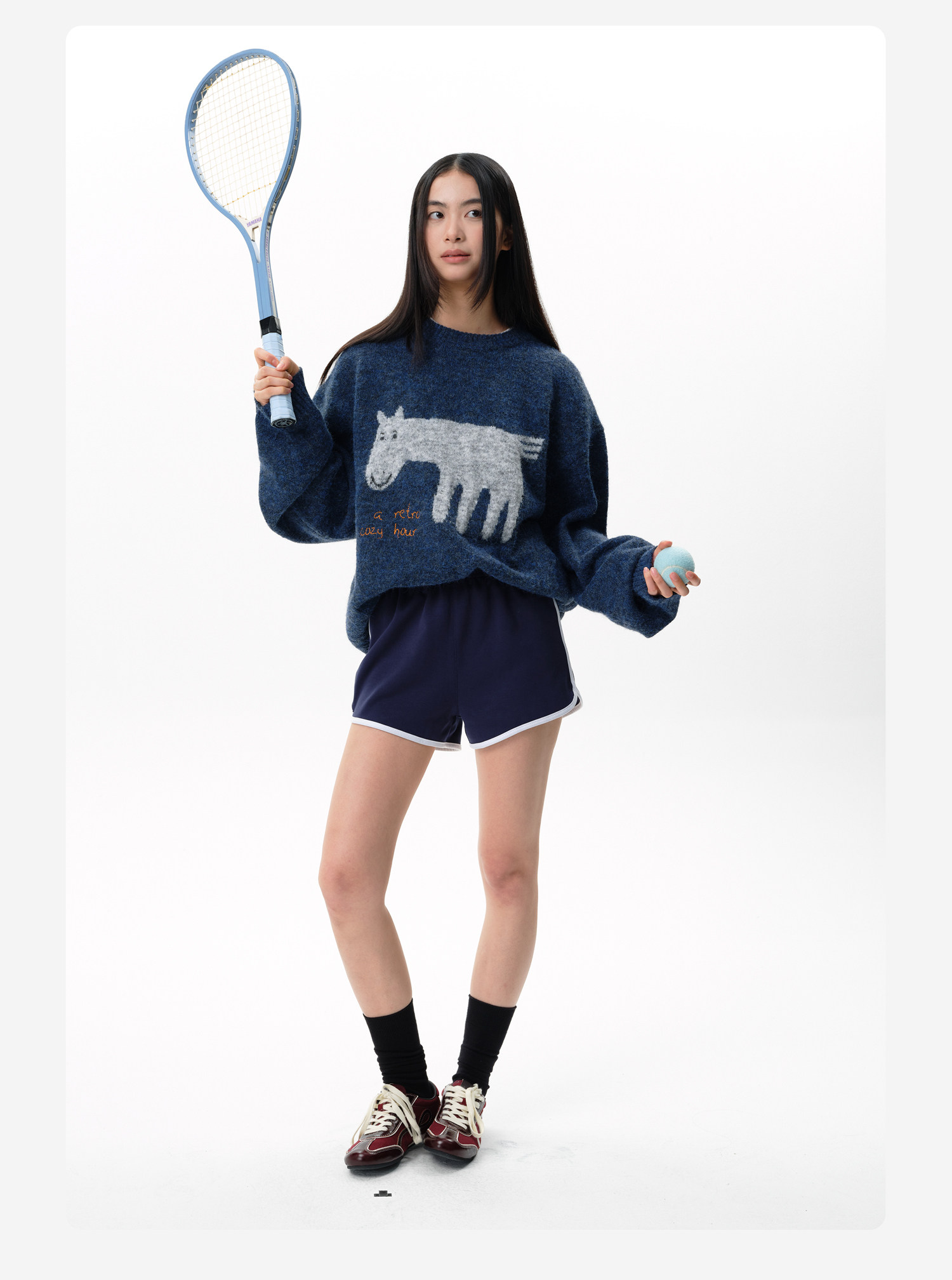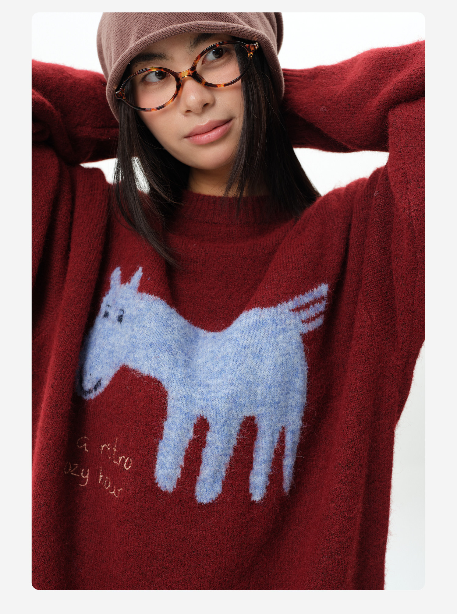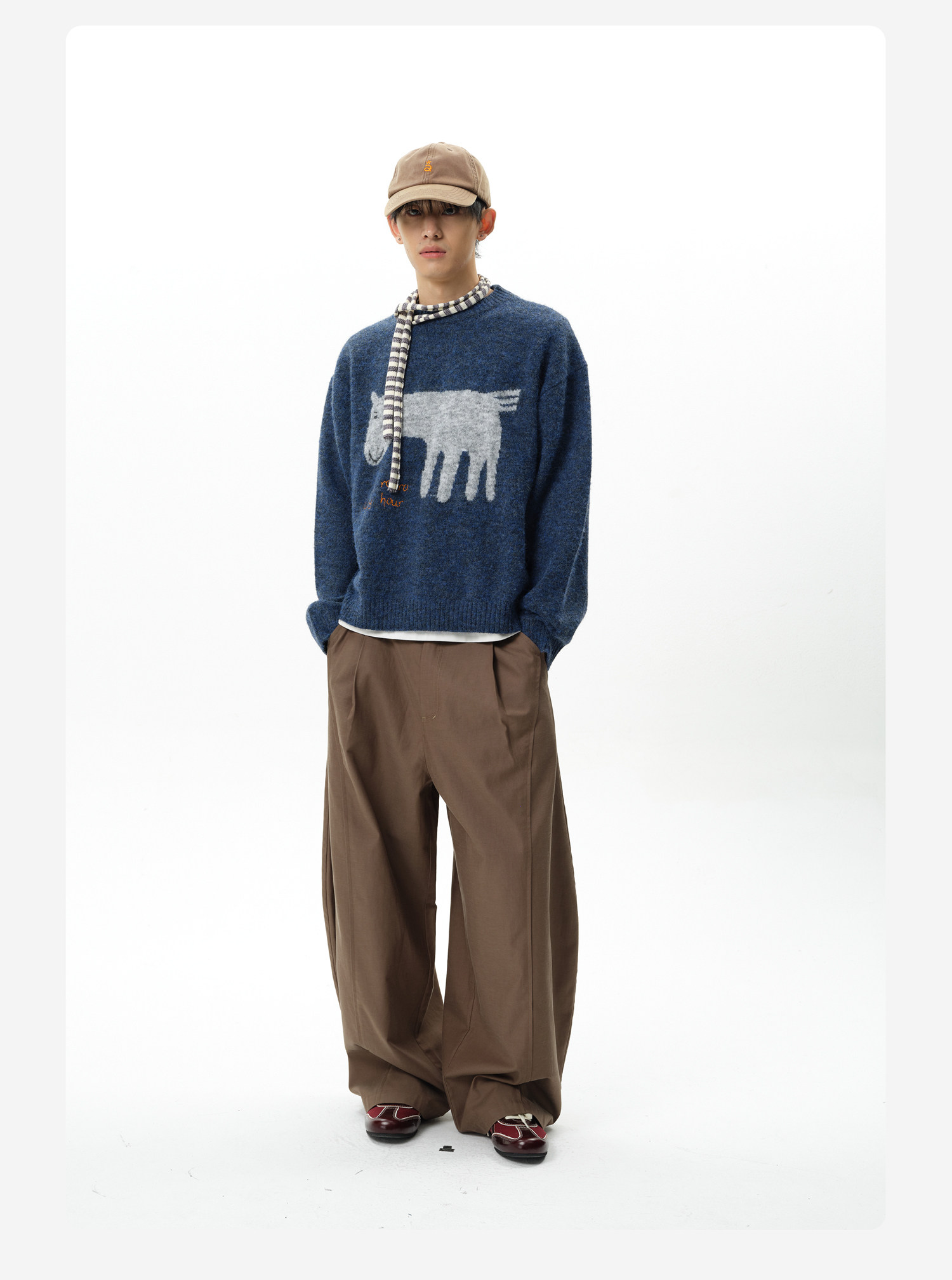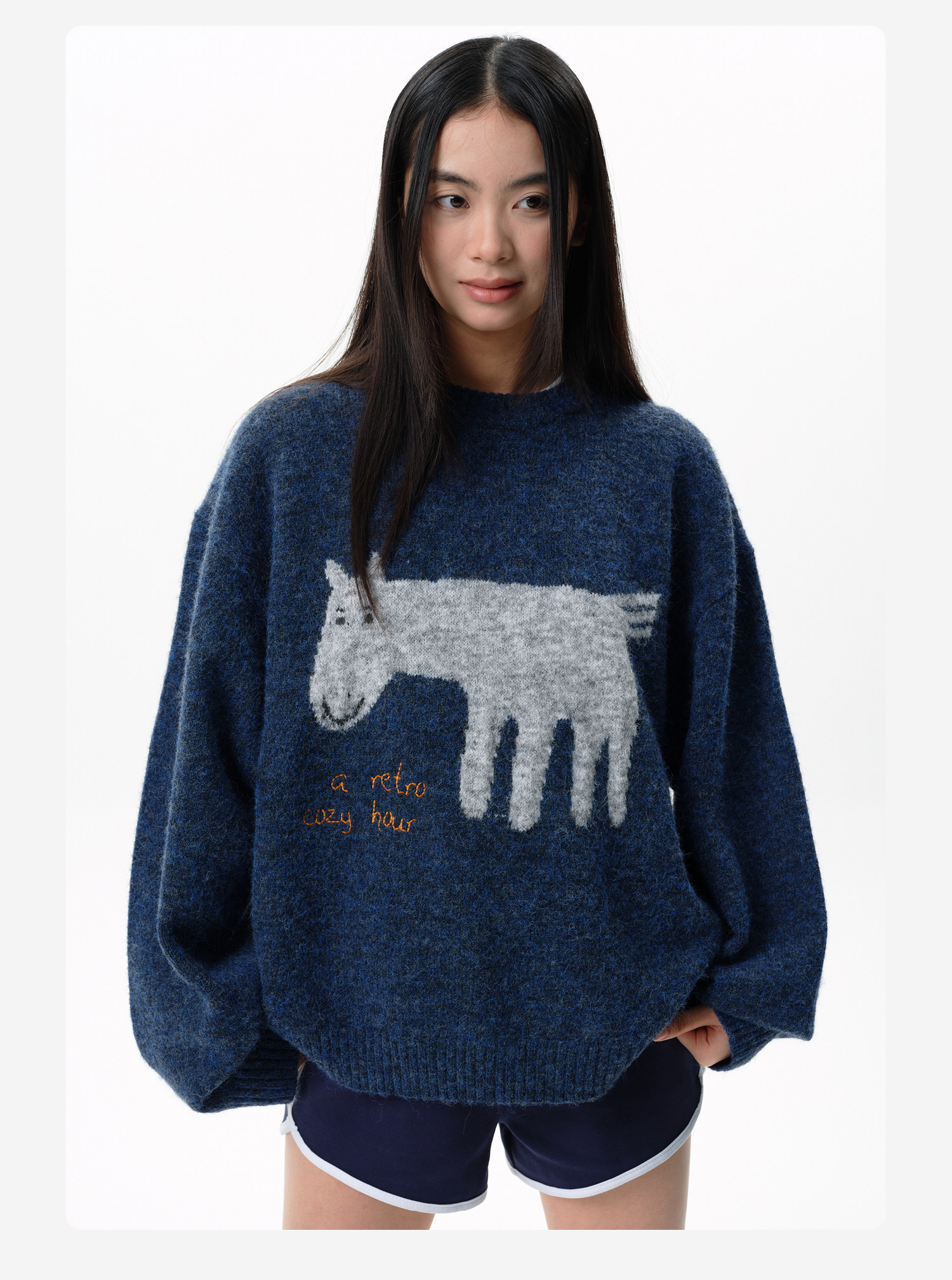 Roaringwild a Arch Roaring Beast Color-Blocked Pony Couple Style Loose Merino Wool Crew Neck Sweater for Men