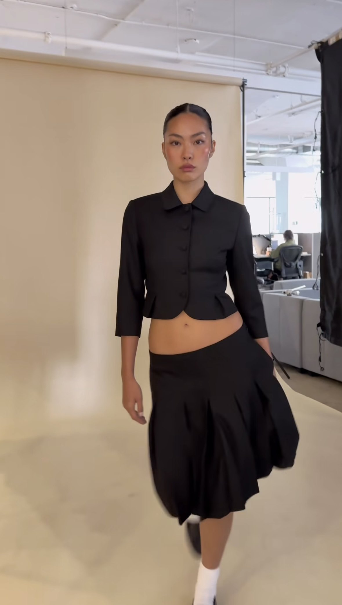 Guizio Black Doll Collar Slim-Fit Short Blazer Retro Elegant Black Low-Waist Pleated Skirt