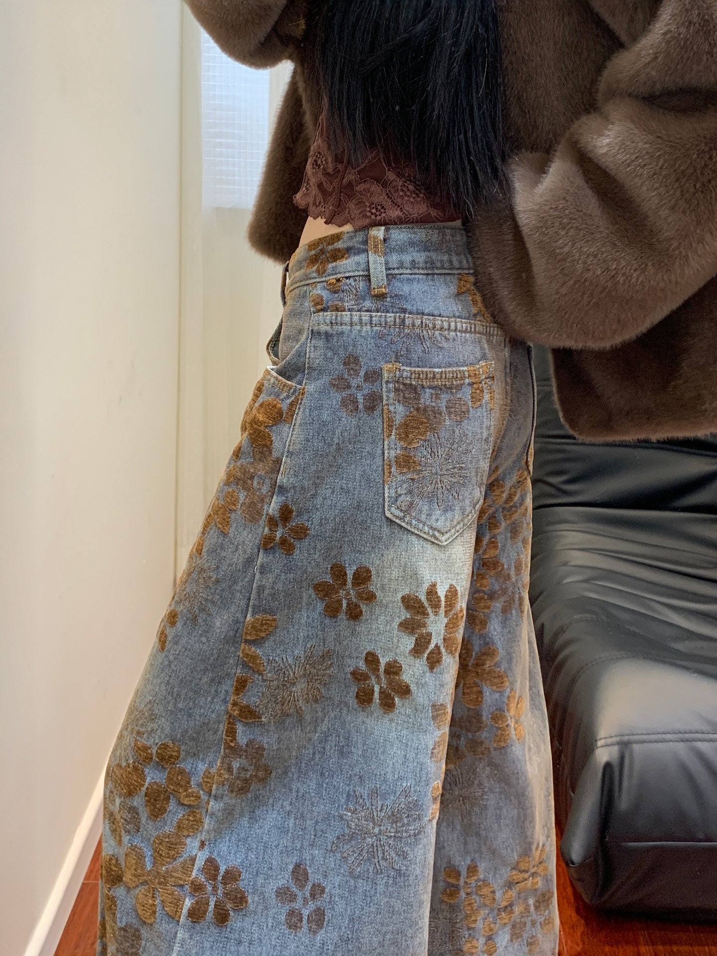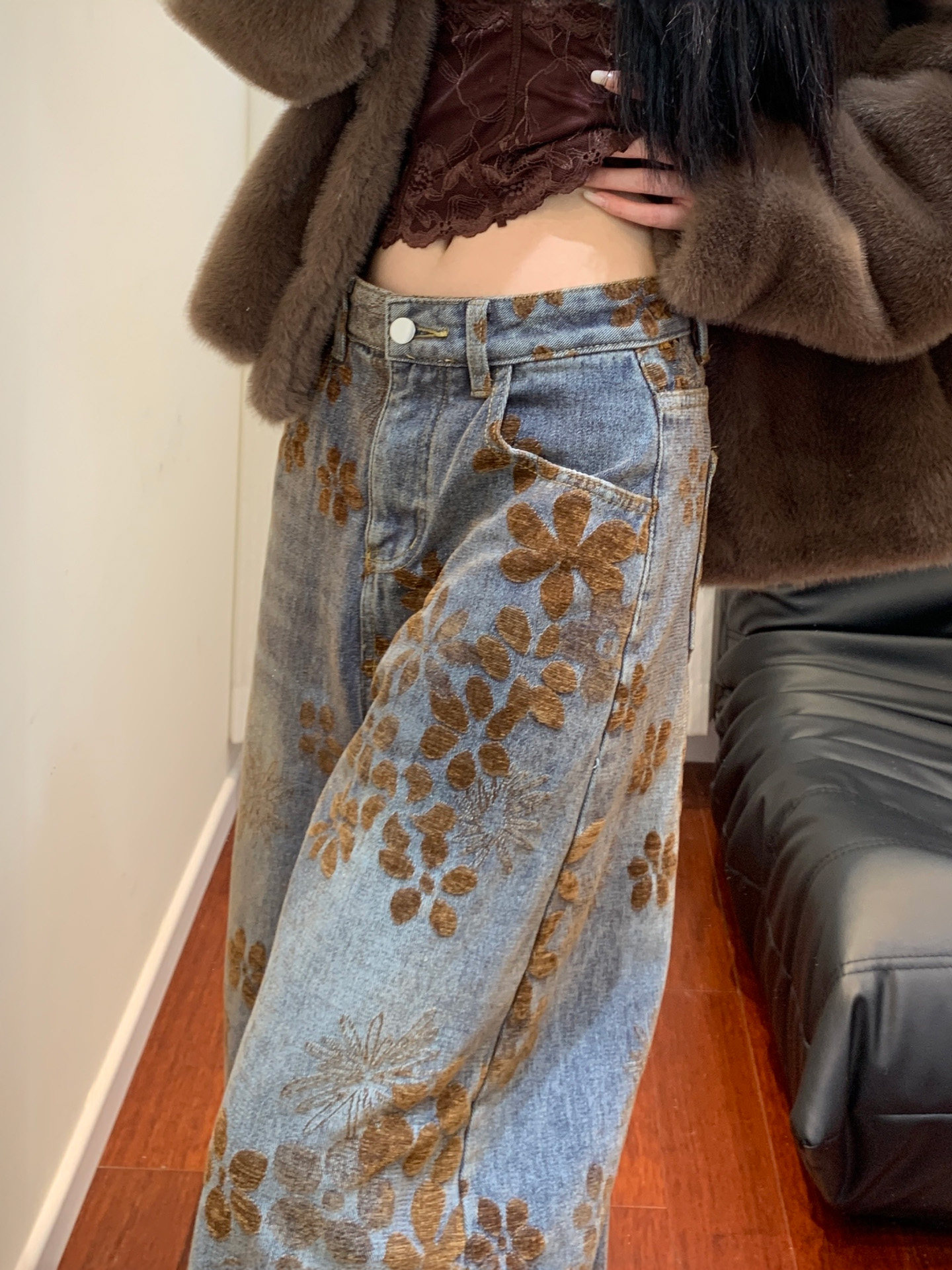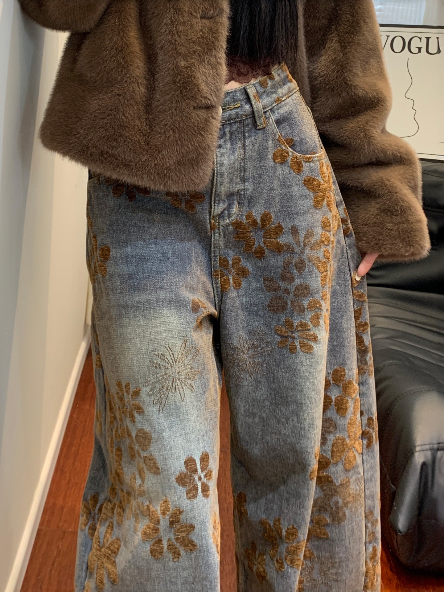 American Retro Jacquard Scimitar Jeans for Women, Autumn and Winter, Fleece-Lined, Plus Size, Design-Conscious, Slimming, Loose Wide-Leg Pants