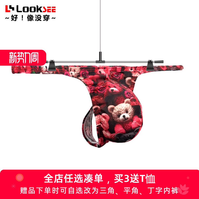 Bear single-legged pants, ultra-thin ice silk low-waisted small thin-edged thongs, men's floral underwear, U convex sexy T-pants