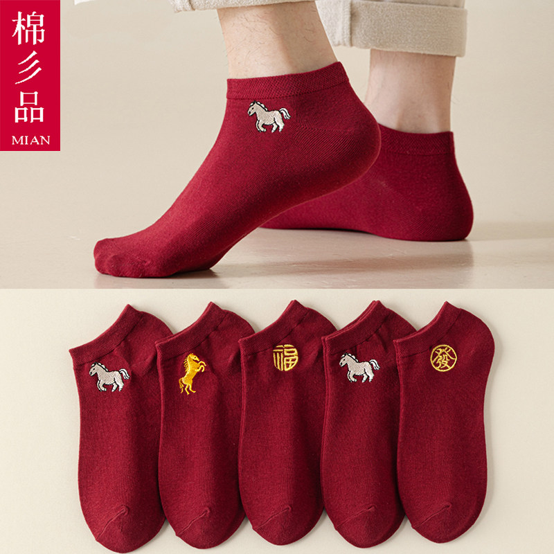 Year of the Horse burgundy natal year socks red socks red men's and women's socks couple boat socks short socks happy word wedding socks