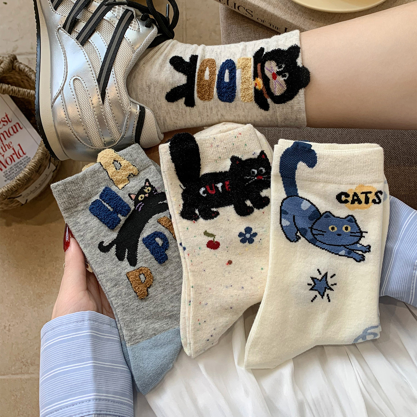 Cartoon cat socks, women's mid-leg socks, spring and summer cotton socks, Korean version Japanese flocking, cute ins trend, spring stockings