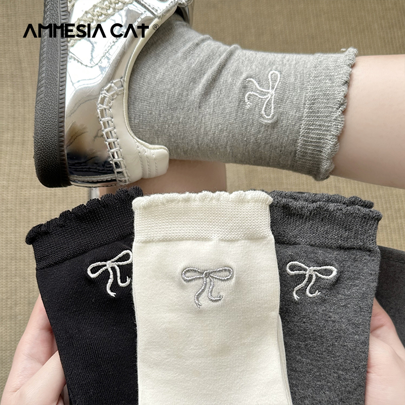 Bow socks women's autumn and winter pure cotton mid-core cute lace stockings gray miu ballet style autumn
