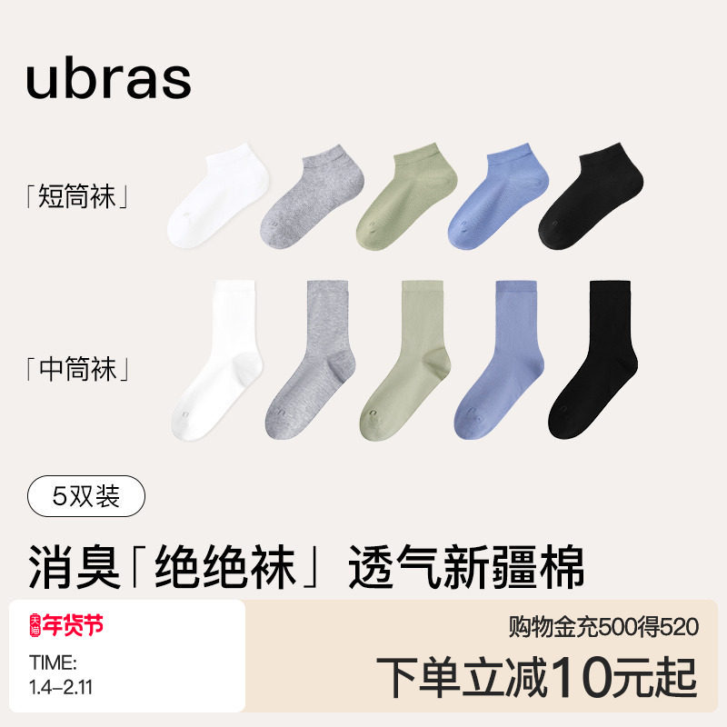 ubras Xinjiang cotton breathable men's short socks 7A antibacterial and anti-odor women's socks sweat-absorbing socks cotton socks autumn and winter 5 pairs
