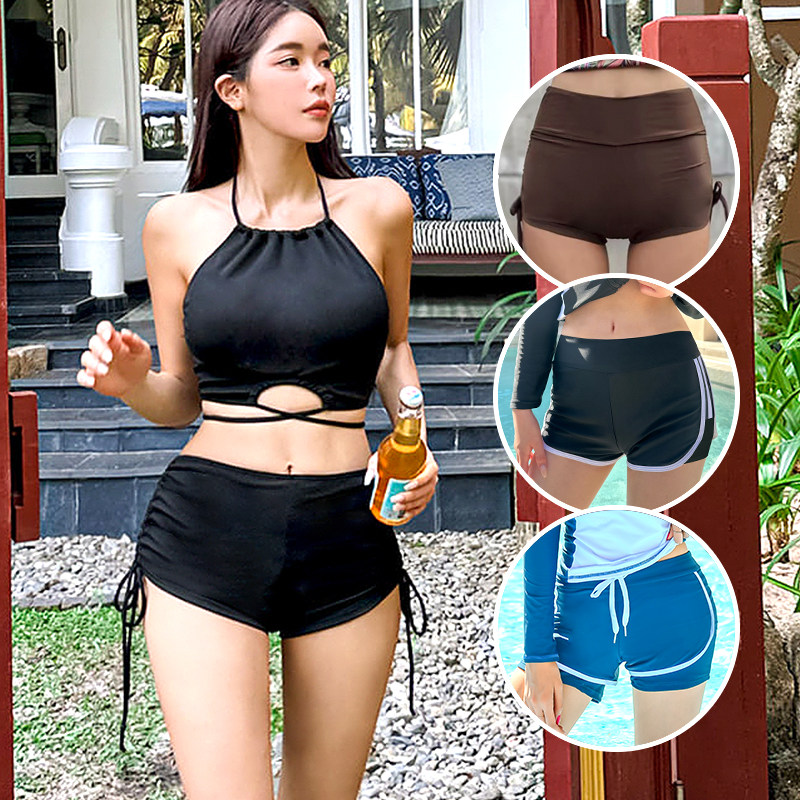 Summer new solid color high-waisted swimming trunks women's European and American seaside vacation drawstring casual three-point pants beach pants women's thin style