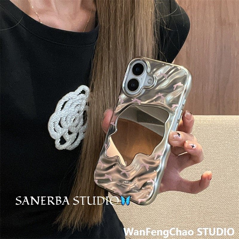 Simple ripple mirror small bow for iPhone17promax phone case 14/15 protective case 15pro female