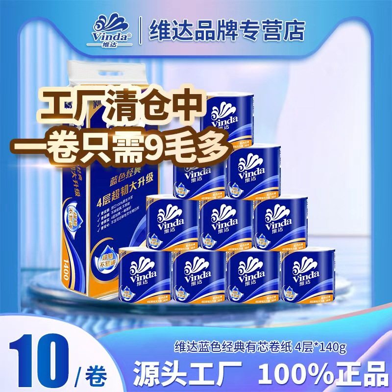 Vinda Sanitary Roll Paper Blue Classic 4 Layers 140g 10 Rolls of Household Toilet Paper Sanitary Roll Paper Towels Spot Batch