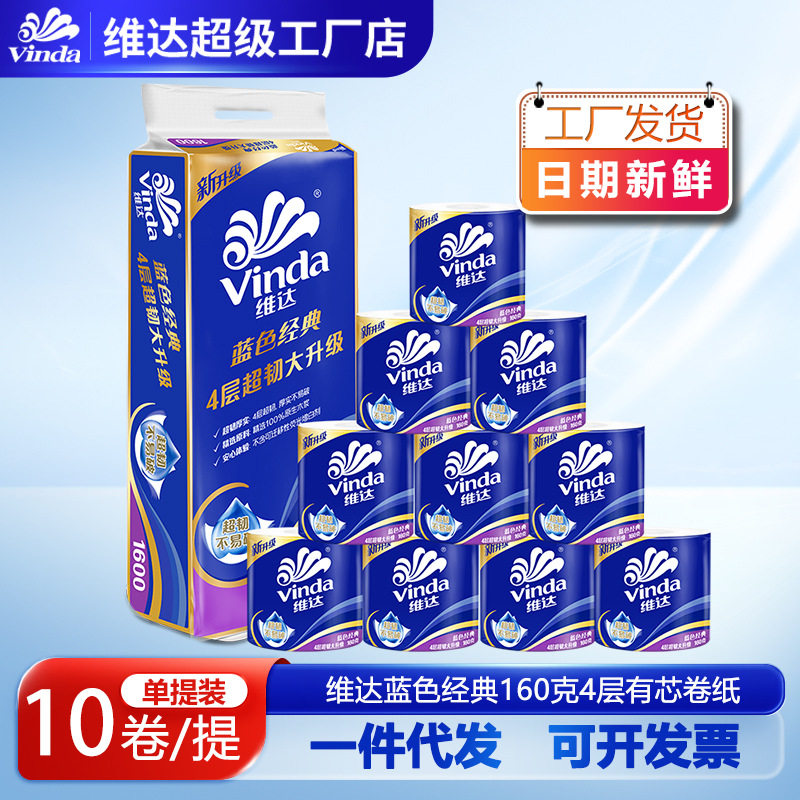 Vinda Roll Paper Blue Classic Core Roll 4 Layers 160g 10 Roll Toilet Paper with Core Roll Paper for Toilet
