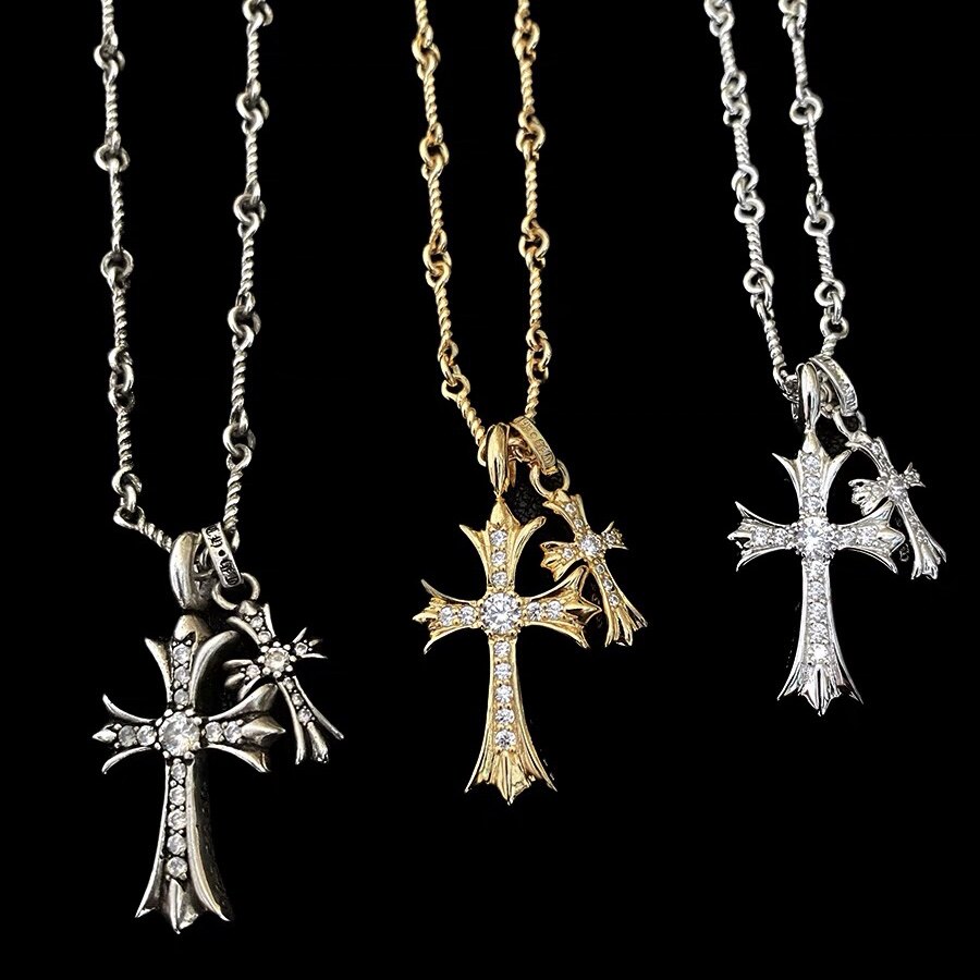 S925 sterling silver double cross necklace gold-plated and diamond-encrusted Yi Mengling has the same personality punk style versatile sweater chain