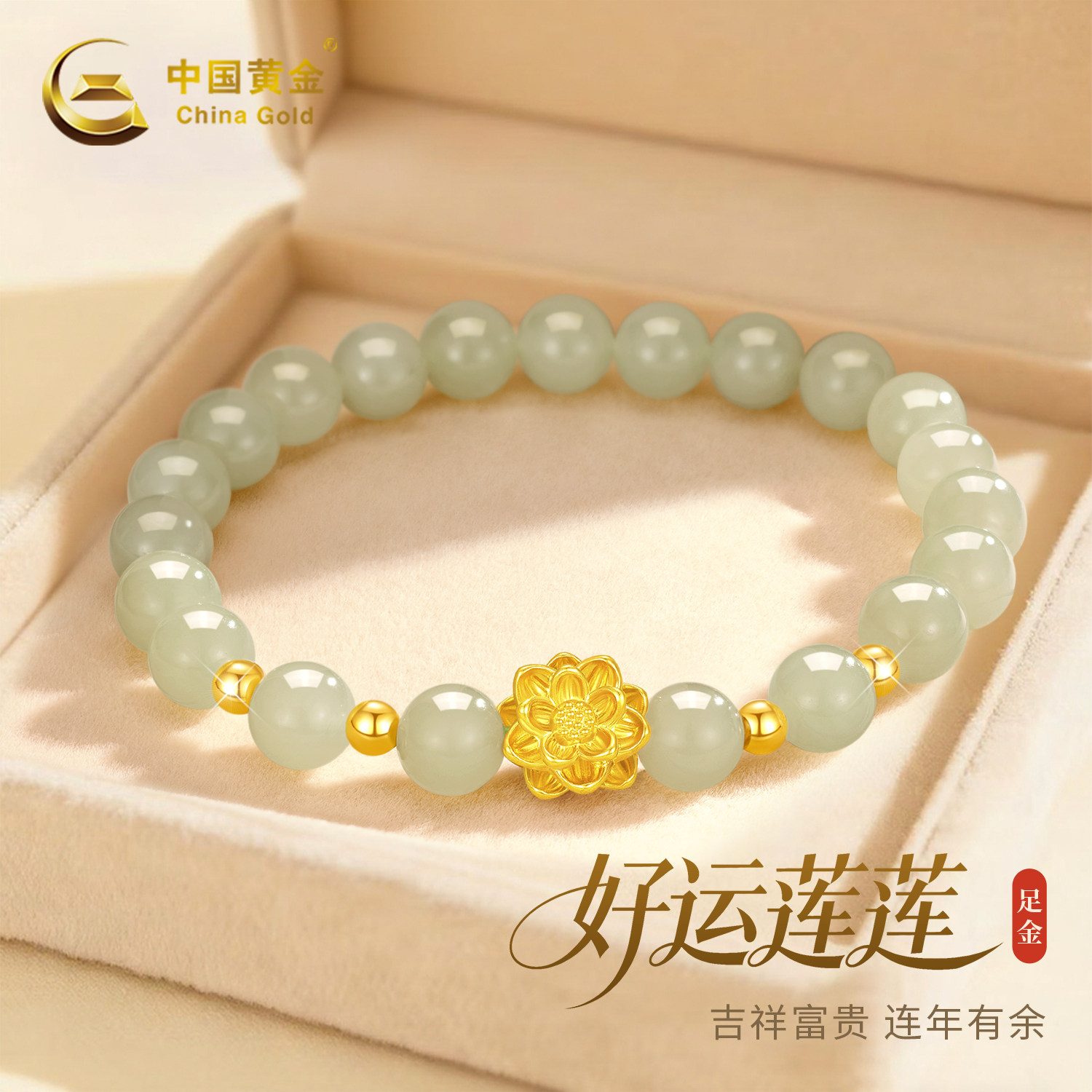 China Gold Lotus Bracelet Women's Pure Gold Girls 2026 New Hetian Jade Bracelet Birthday Gift for Mom