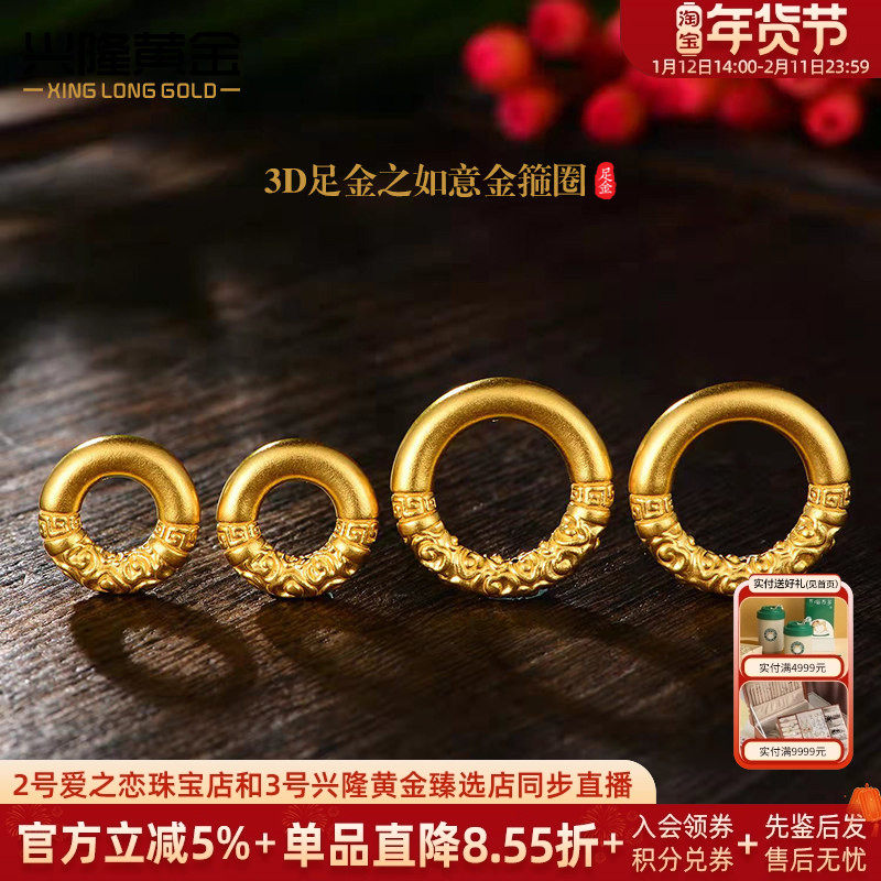 Xinglong gold 3D hard foot gold 999 ruyi gold hoop pendant necklace safety buckle couple bracelet bracelet beaded woman