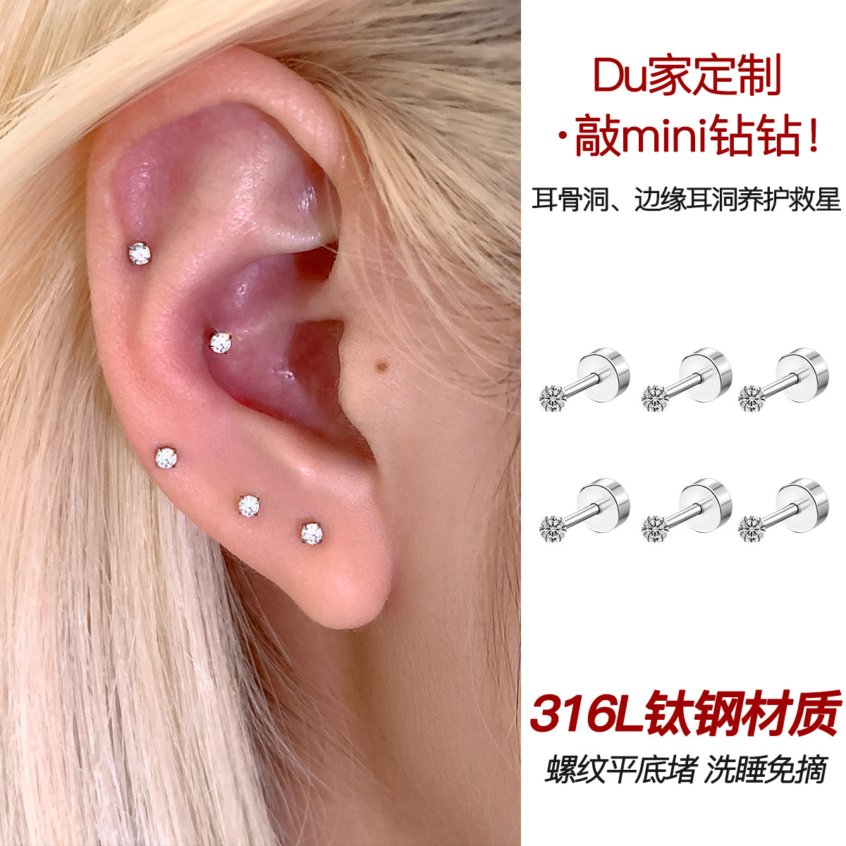 Medical titanium alloy earrings pop flash Huazi diamond stud earrings titanium steel cochlear ear bone studs women care ear piercing sleep without removal