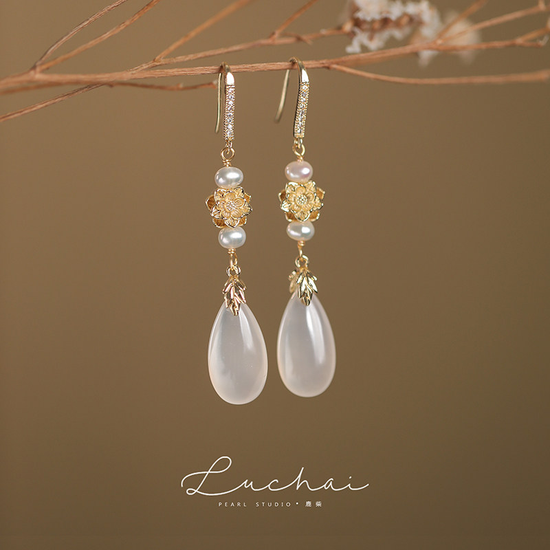 New Chinese lotus chalcedony earrings 2025 new explosive high-end antique style earrings are unique for women