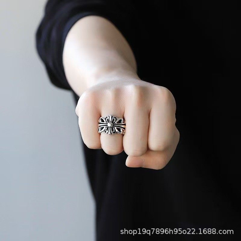 All-over S925 sterling silver cross opening ring for men and women vintage trend hip hop silver jewelry ring
