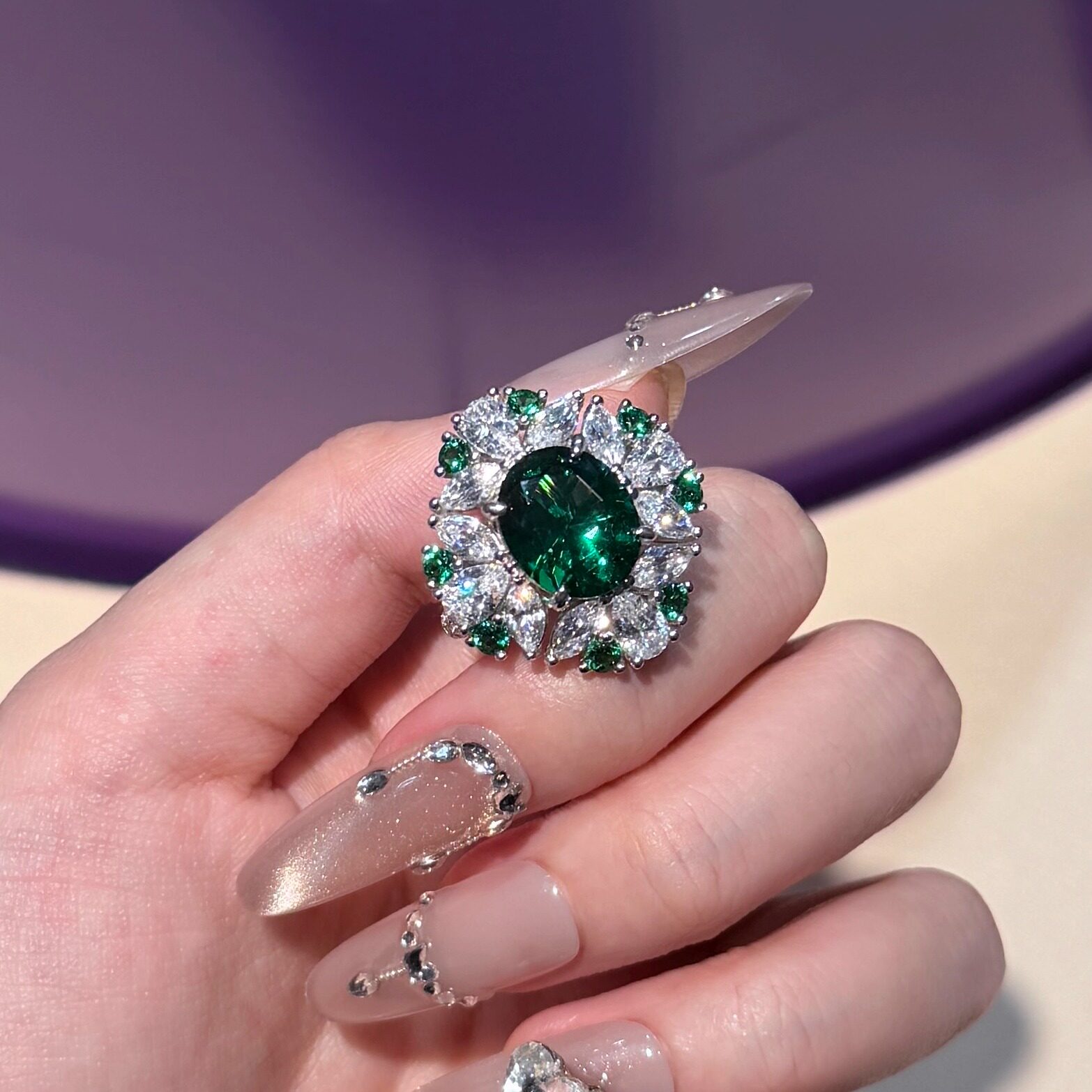 S925 silver needle zircon emerald diamond ring temperament fashionable retro high-end sense versatile super flash ring