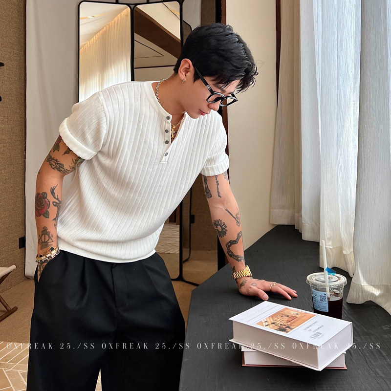 OXFREAK "Old Money Style Texture Pit Strip" Solid Color Henry Neck Short Sleeve T-Shirt Men's High-End V-Neck Half Sleeves