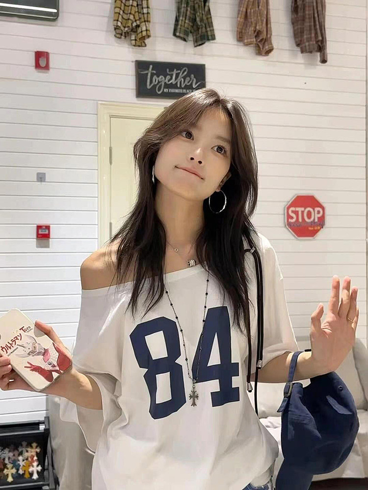 Sweet and Spice Girl Letter Print Slanted Shoulder Short Sleeve T-Shirt Women's Summer 2025 New Loose and Versatile Off-the-Shoulder White Top