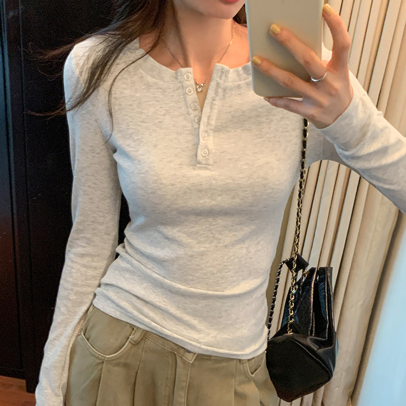 White flower gray shoulder base shirt women's spring, autumn and winter half-open collar, slim and spicy inner top, simple long-sleeved T-shirt