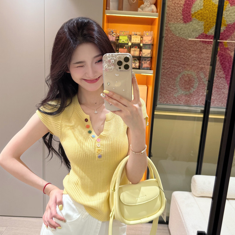 Korean version of dopamine button V-neck knitted short-sleeved T-shirt women's summer small fragrance design sense temperament slimming chic top