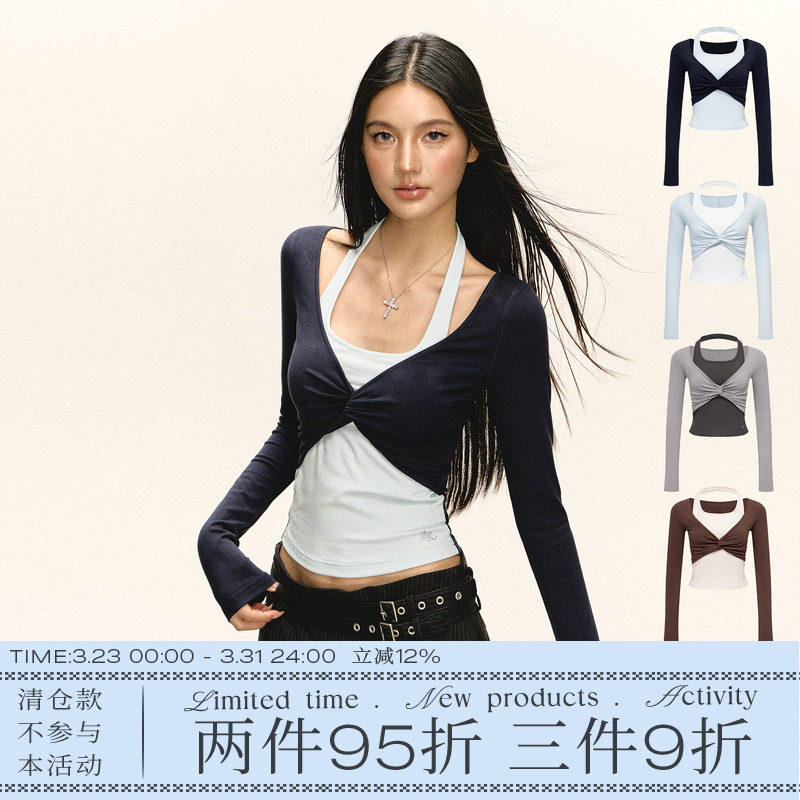 Ariseism American Vintage Design Fake Two Long Sleeve T-Shirts Women's Spring New Spice Girl Slim Top