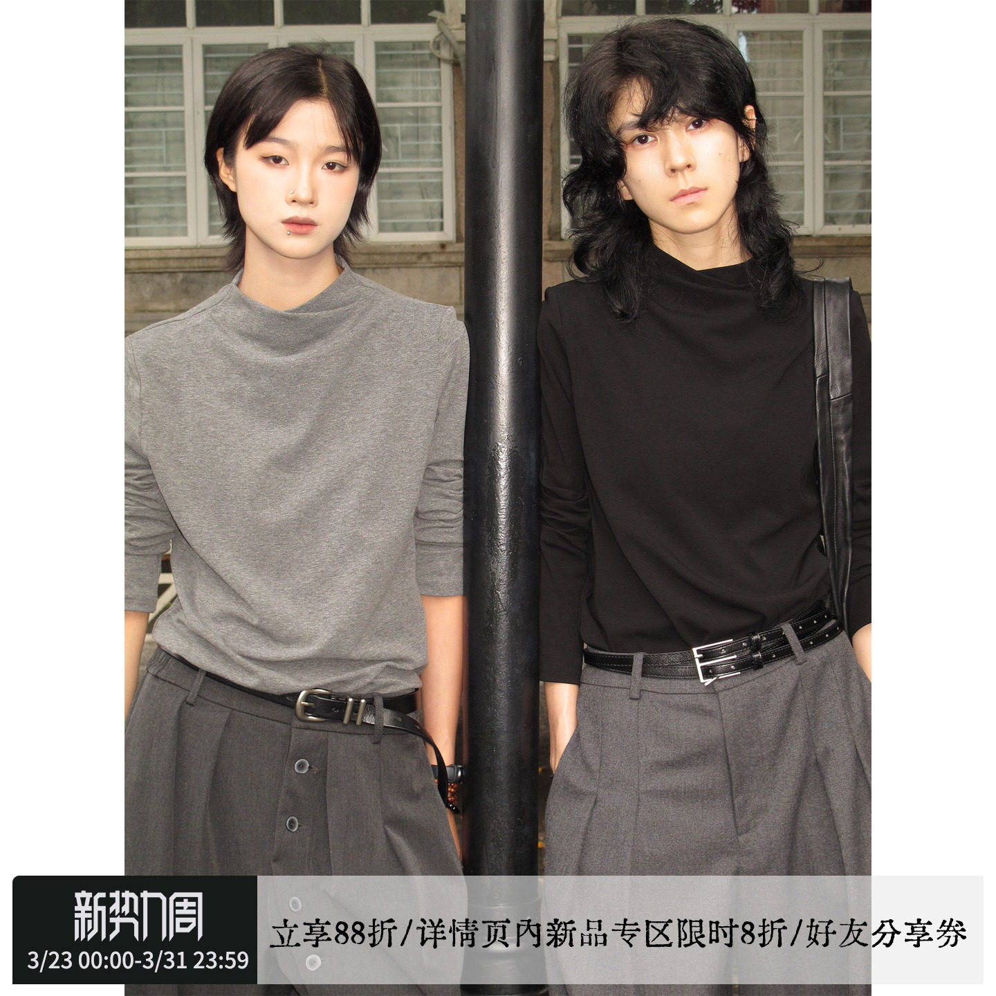 Jim Kennet wears a slanted shoulder-printed T-shirt with loose short-sleeved tops
