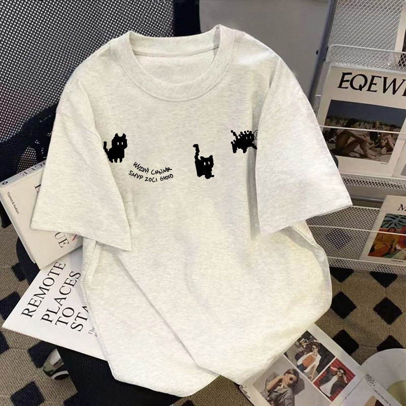 White and gray kitten short-sleeved T-shirt women's pure cotton 2026 summer new explosive loose plus size printed top shirt