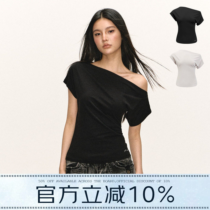 Ariseism American vintage design slanted shoulder short sleeve T-shirt women's summer new off-the-shoulder waist slim top