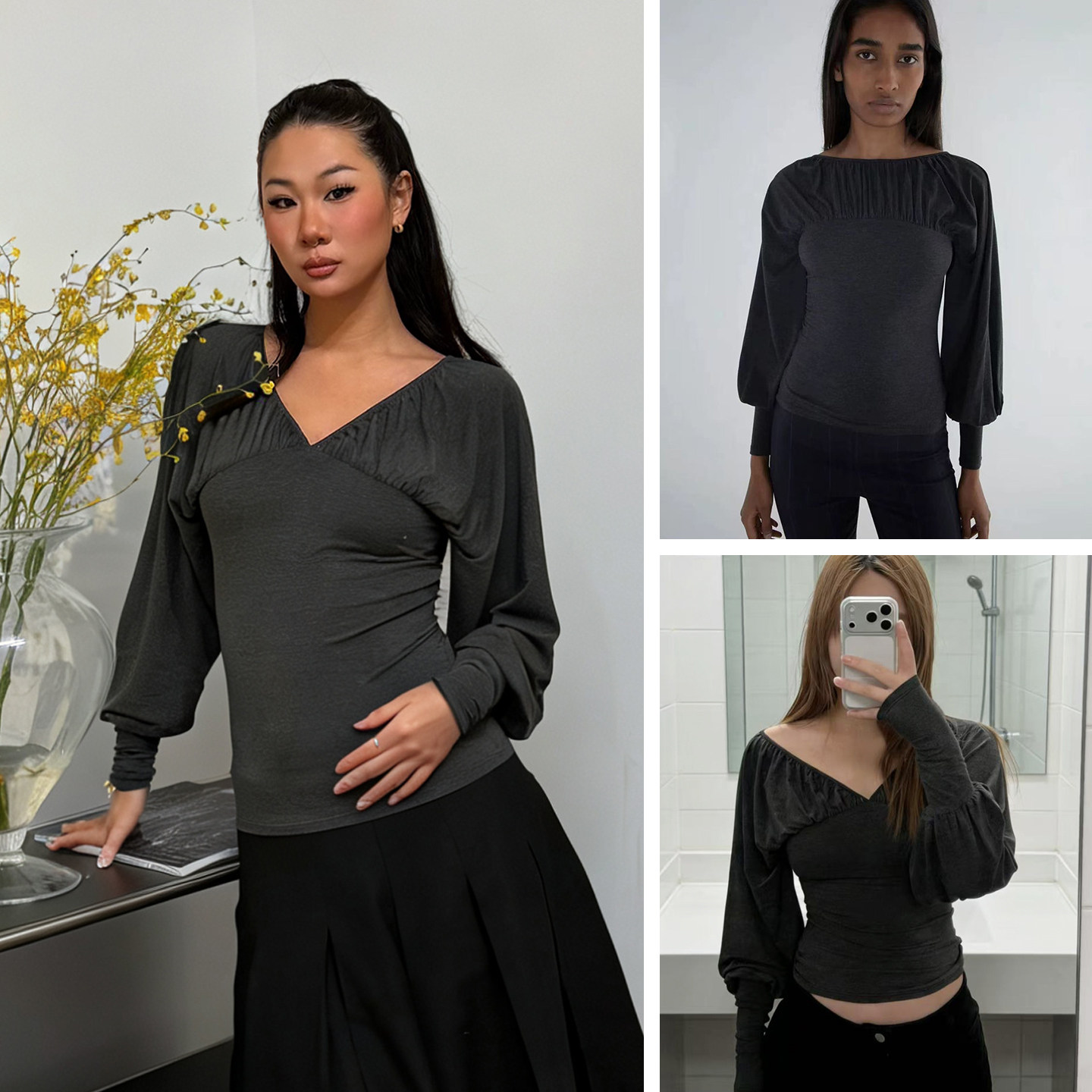 Paloma wool dark gray V-neck pleated panels slim long sleeves and lamb shank sleeve tops on the front and back