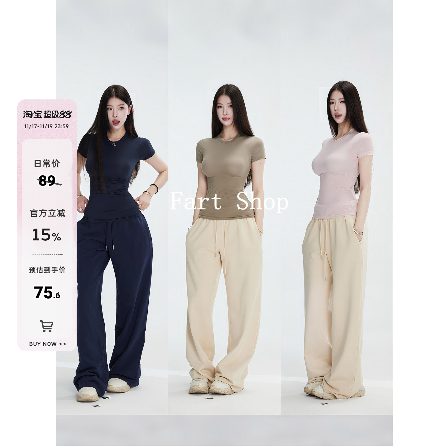 【Fart Shop】skim* Short sleeve spring and summer slim stretch straight shoulder tight pink T-shirt half sleeve top for women