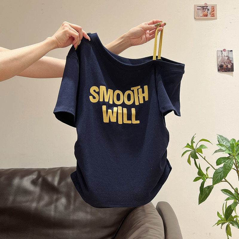Navy blue slanted shoulder off-the-shoulder short-sleeved women's T-shirt 2026 summer design contrast shoulder strap pleated waist printed top