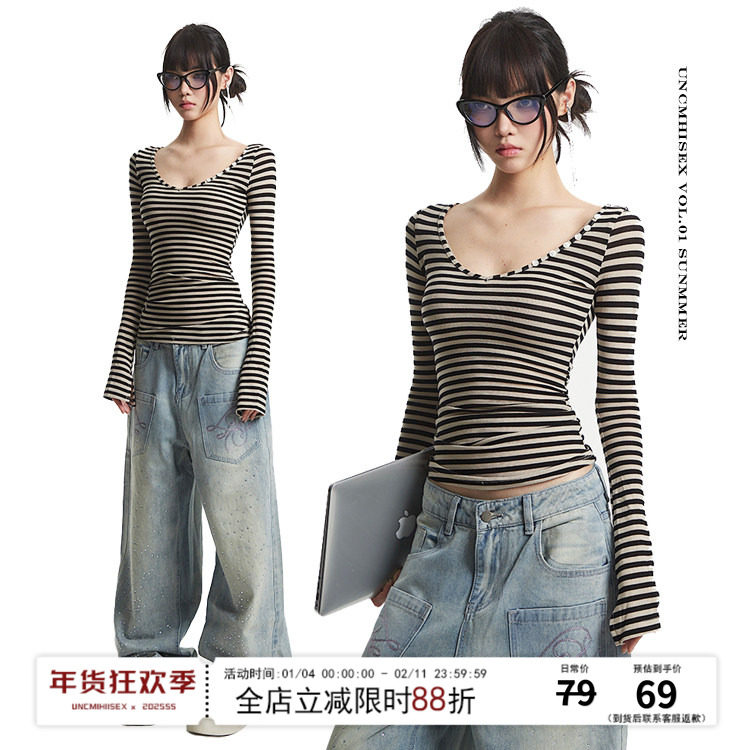 UNCMHISEX Vintage Striped Long Sleeve T-Shirt Base Jacket Women's New Slim Hot Girl Design Inner Top