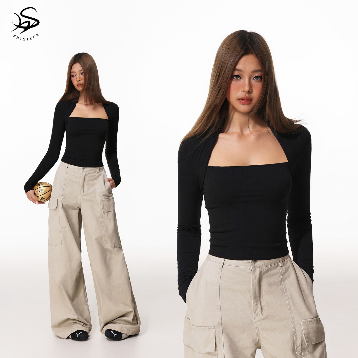 SHIYIYUE American fake two-piece cropped base top, women's autumn and winter slim black T-shirt, slimming with long sleeves inside