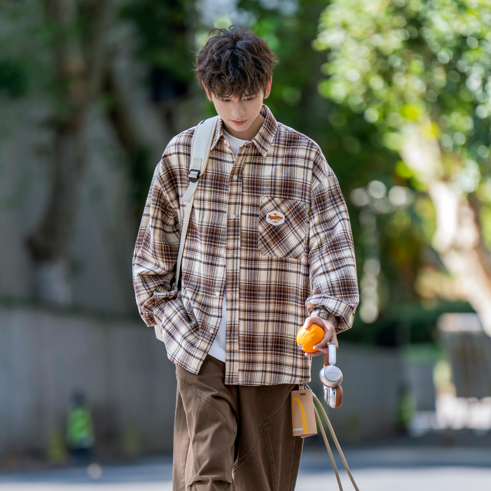 PD Japanese retro plaid shirt autumn and winter Maillard outfit boys' fleece and thickened brushed plaid shirt