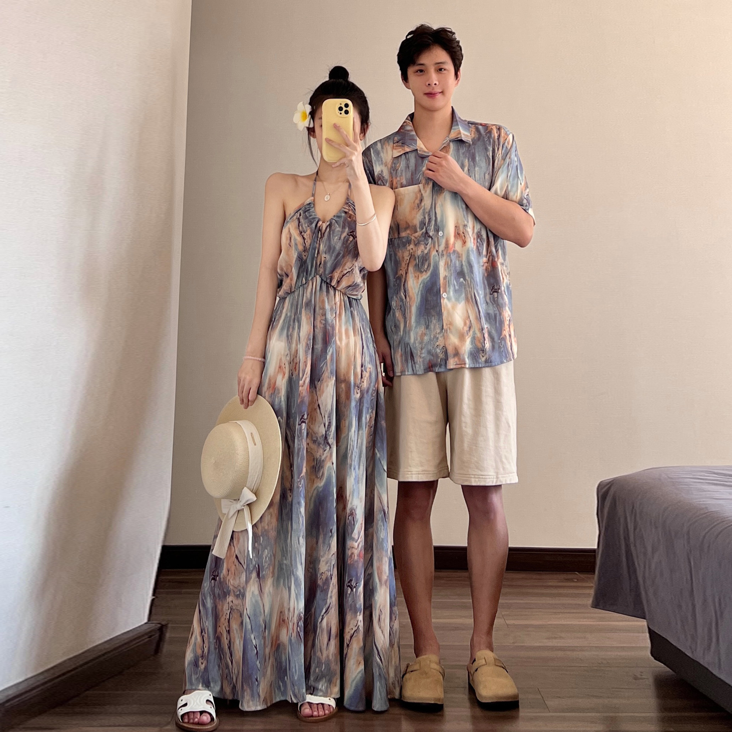 Seaside vacation couple outfit summer tie-dye short sleeve shirt halterneck slip long skirt French dress one dress at a time