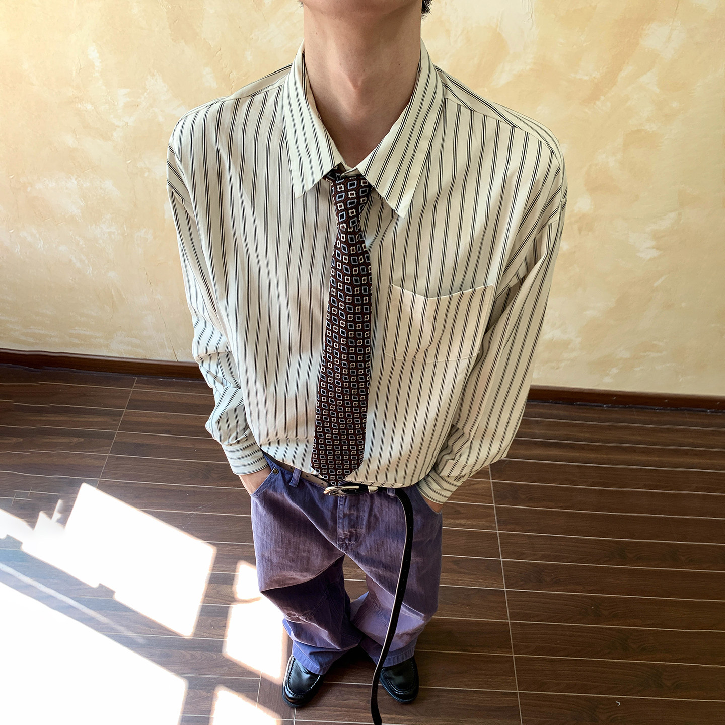 Oalin American contrast striped simple lapel shirt for men and women with a sense of luxury retro ruffian handsome commuter long-sleeved top