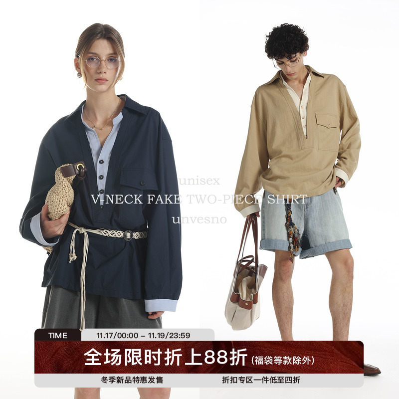 [Fake two] Unvesno (UN) old money lyocell autumn V-neck contrast loose casual long-sleeved shirt