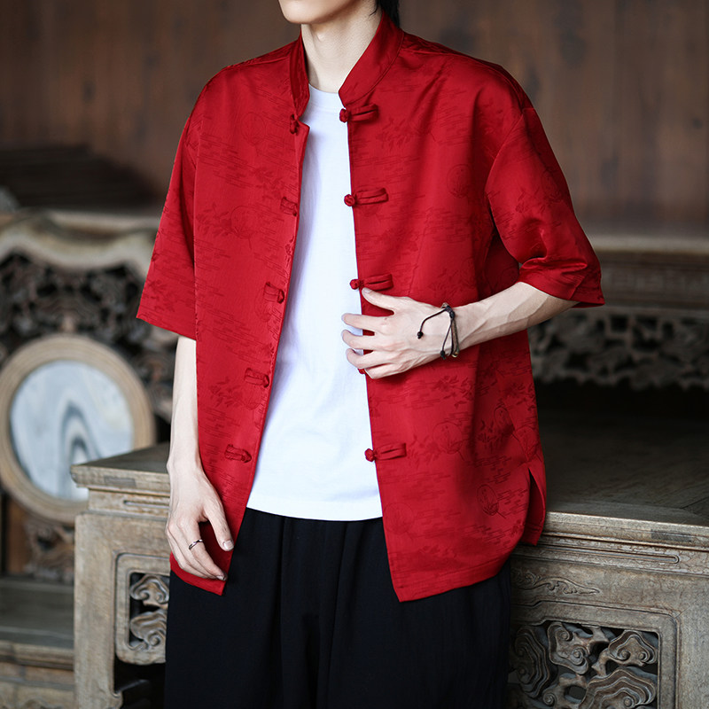 National style summer new Chinese red buckle wedding brotherhood performance plus size Tang costume Hanfu short-sleeved shirt top