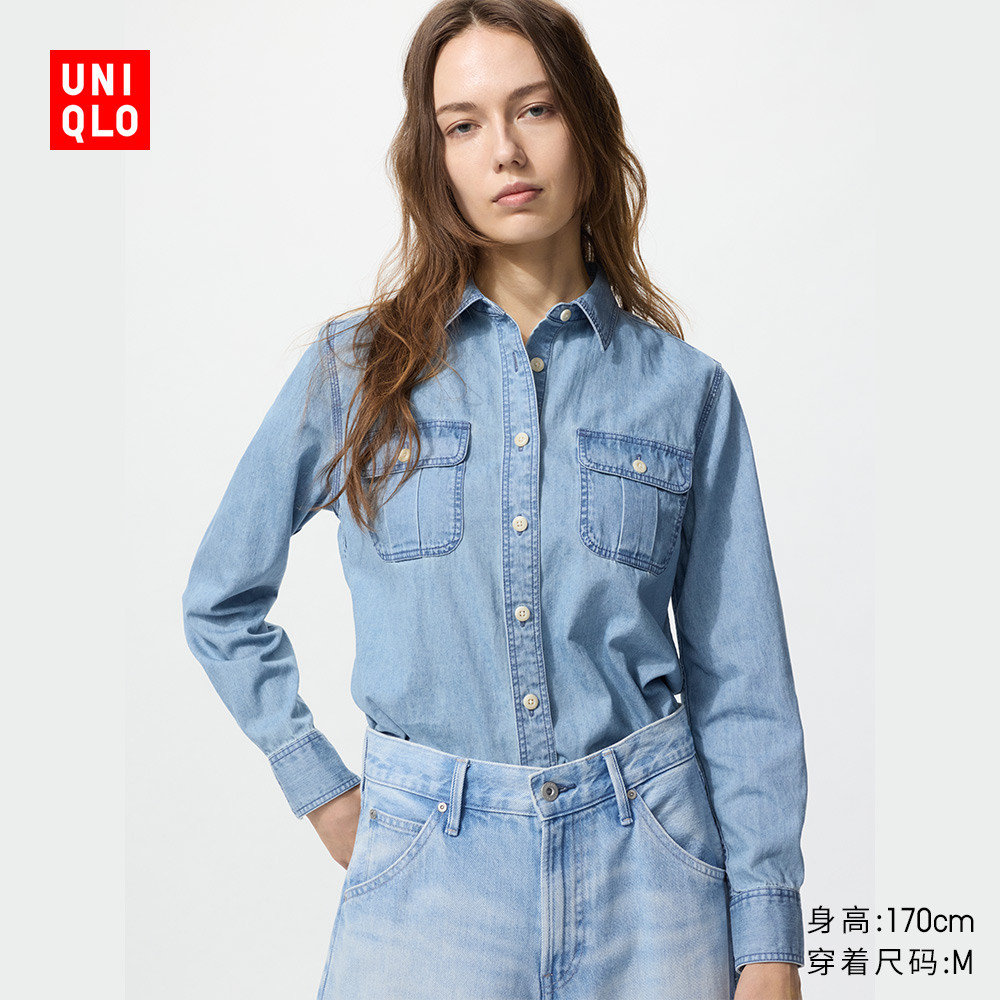 Uniqlo Women's Denim Cargo Shirt/Long Sleeve Washed Product Jacket Commuter Casual 480004