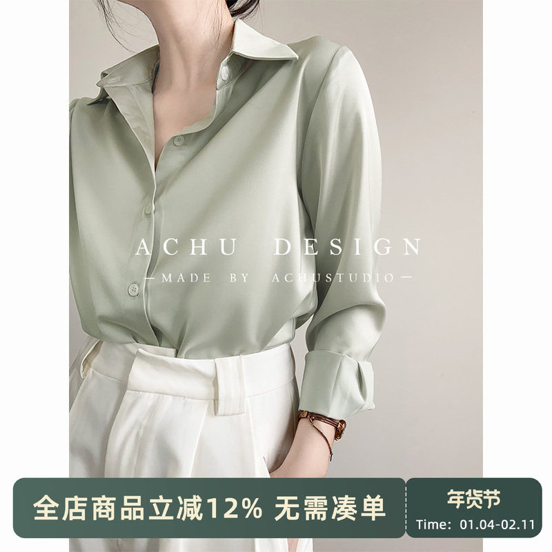 ACHU Spontaneous Minimalist Green Satin Shirt Women's Premium Professional Interview Shirt Light Workplace Commuter Top