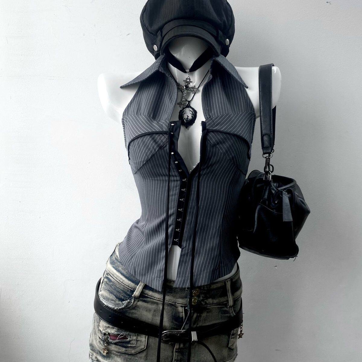 American vintage dress vintage temperament striped stand-up collar sleeveless shirt top waist cinched old-fashioned millennial hottie y2k