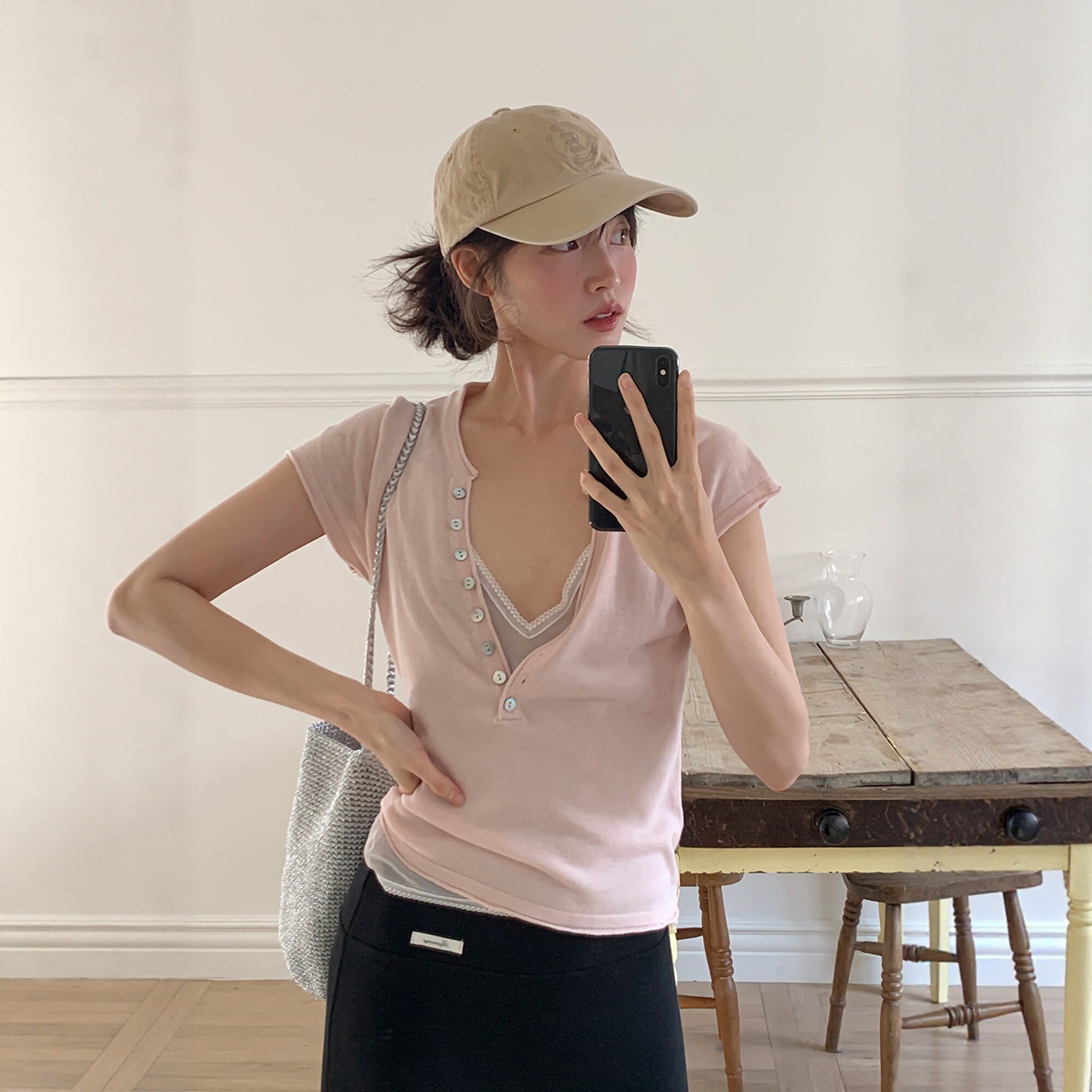 Twodaysoff Korean design fake two contrasting cotton plaid shirts short-sleeved women's tops